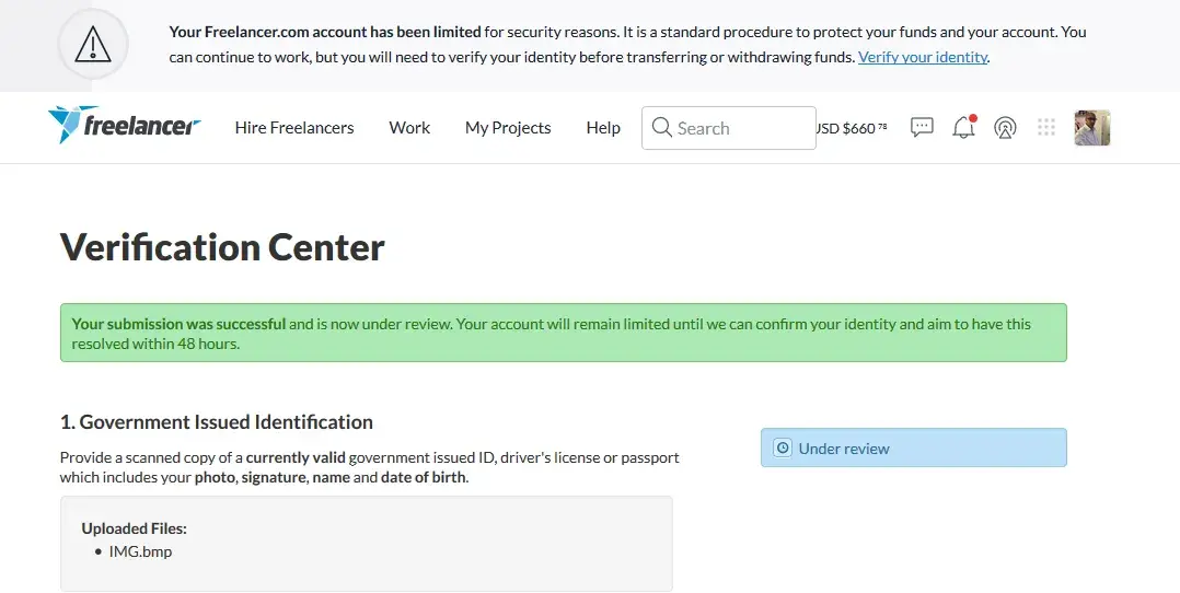 I have some talk with verification authorities of freelancer. I also successfully verify all documents but they suspend my account .they want me to choose one account but i only have one account which i use. I have $850 in my account with 8 ongoing projects on freelancer and 16 reviews feedback which i earn from my efforts and hasd working please let me know how you want to give me justice. i got the message ‘Your Freelancer.com account has been limited for account security reasons. Until we can verify your identity, we need to limit functionality of your account. You can continue to work and receive payments, but you won’t be able to transfer or withdraw funds.’ I provided them my scanned ID and a photographic proof that I was actually the owner of the ID .they found some other id and they believe that that account was mine but i only have one account! and i also tell they to close the other one if you think it was mine ! but they are saying talk with owner of that account which i dont know ! and they want me to do agreement with that owner accountthat i dont know ... I do not did any mistake according to me... please help me my user name is - ecurser1 mail address associated - [protected]@gmail.com the date you last used my freelancer - today at 1:00 IST