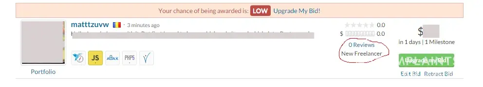 I am a freelancer member since 2004(not here, on rentacoder/vworker). I have lots of reviews. Yet, my bid on the project shows me having 0 reviews and new member, placing my bid the last. This was a sure bid, I asked less than most(who asked too much for something simple) and I had by far the most ratings. Now, instead of waiting for the email telling me the client accepted my bid I can go watch Aston Villa - Man United and have some beers in peace...because my bid is gone.