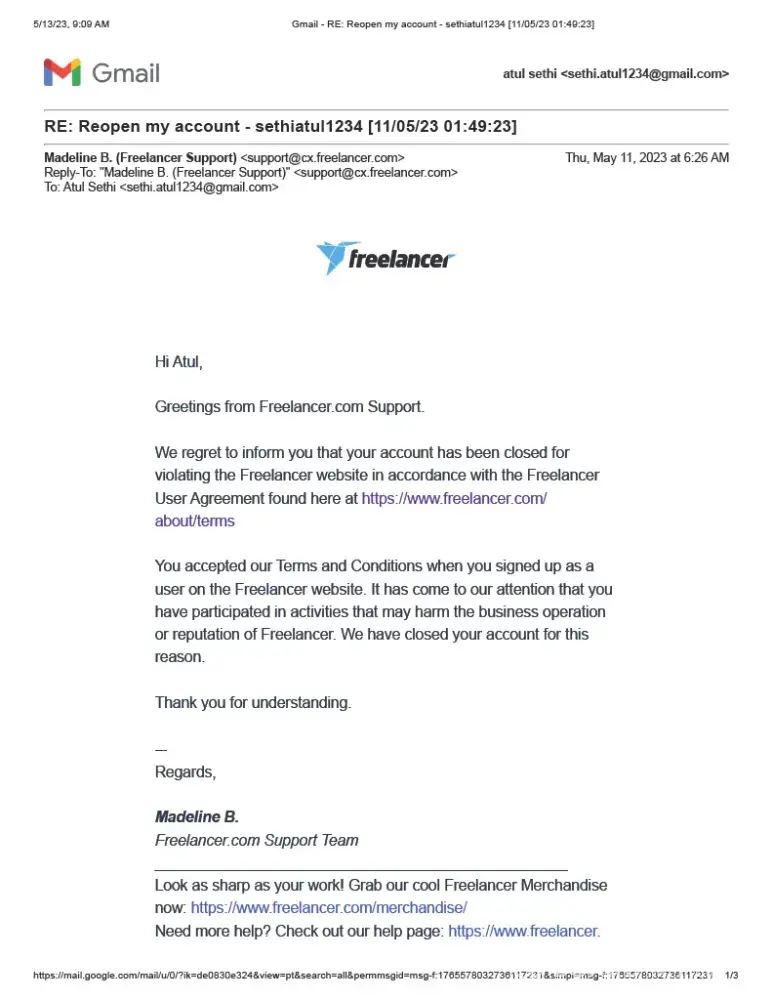 Freelancer.com account closed without any reason and warning