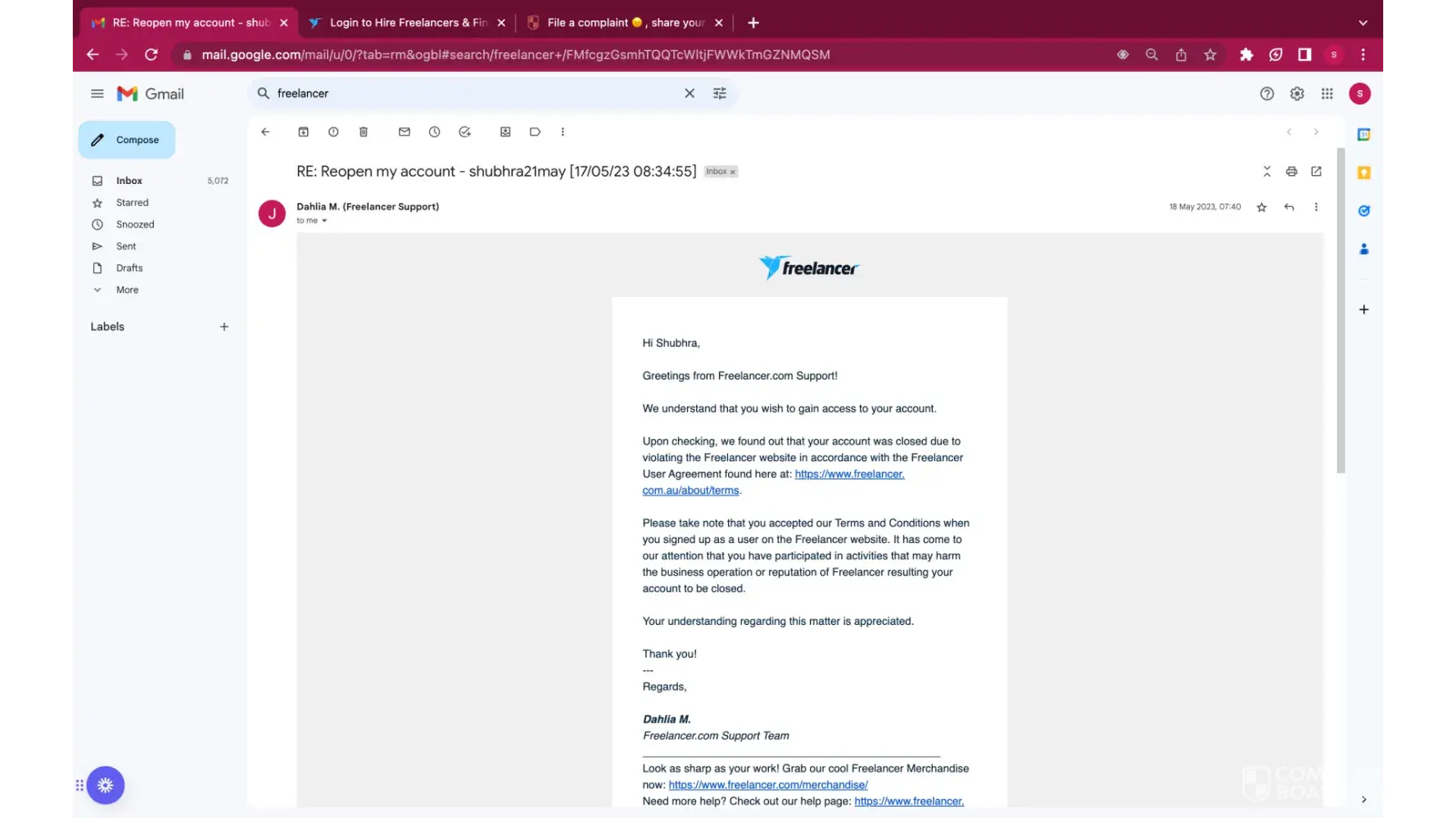 Freelancer.com My account has been closed