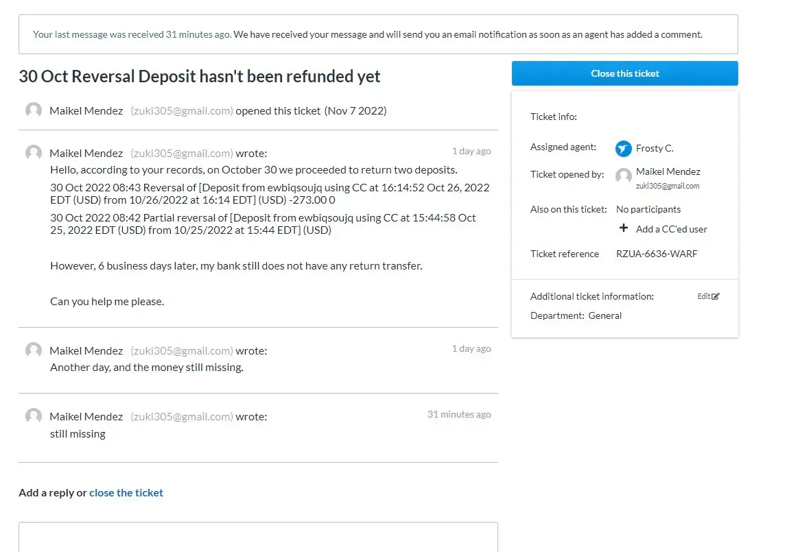 RZUA-6636-WARF) with an agent assigned which today November 9, still has not responded despite the fact that in the last two days I have kept the situation updated about not yet having received the funds.