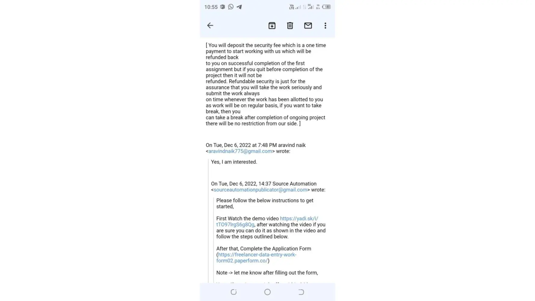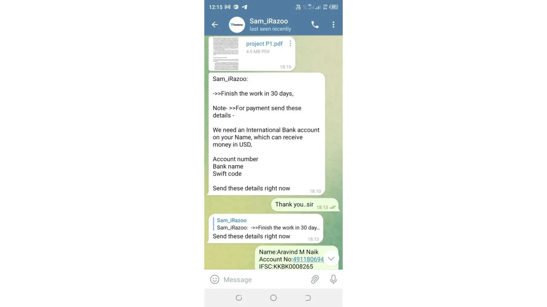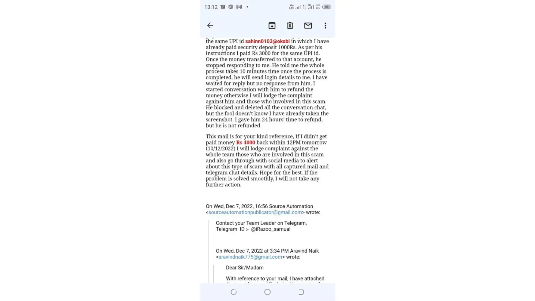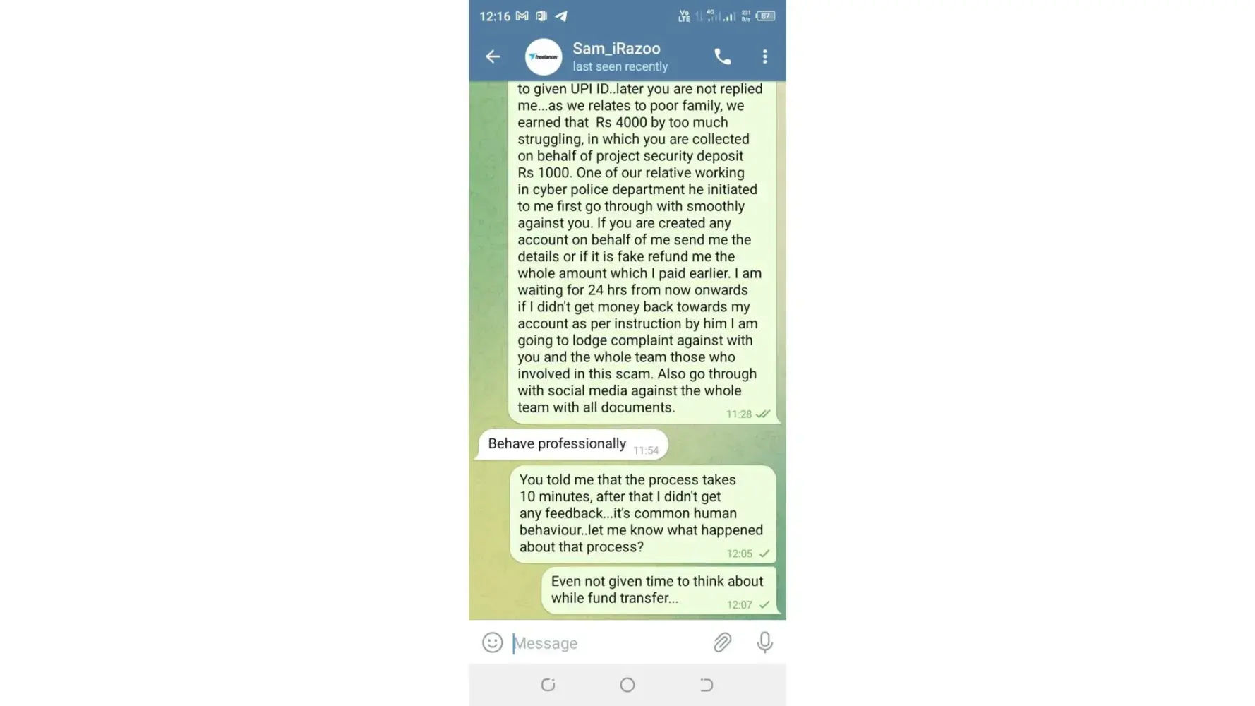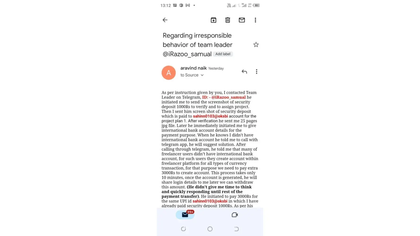 I Freelancer User [edited] and looking for data entry jobs which can be done from home. I choose this platform to continue my professional career. Recently I applied for bid, for that I get response from Aima F.@mairafirg and suggested me to give Freelancer Username , Name , Age and Country Name to their email: [protected]@gmail.com then I sent details through email. As per their instruction I submitted the filled form through https://freelancer-data-work-form01.paperform.co/ .With some terms and conditions they initiated to pay Rs1000 to [protected]@oksbi as security deposit and to fill with duly signed contract form and technical instruction form. After submission of both these form and security deposit acknowledgement, they initiated to contact @iRazoo_samual with telegram app. Later he initiated me to send the screenshot of security deposit 1000Rs to verify and to assign project. Then I sent him screen shot of security deposit which is paid to [protected]@oksbi account for the project plan 1. After verification he sent me 25 pages jpg file. Later he immediately initiated me to give international bank account details for the payment purpose. When he knows I didn't have any international bank account he told me to call with telegram app, he will suggest solution. After calling through telegram, he told me that many of freelancer users didn’t have international bank account, for such users they create account within freelancer platform for all types of currency transactions for that purpose we need to pay extra 3000Rs to create account. This process takes only 10 minutes, once the account is generated, he will share login details to me later we can withdraw this amount. (He didn’t give me time to think and quickly responding until rest of the payment transfer). He initiated to pay 3000Rs for the same UPI id [protected]@oksbi in which I have already paid security deposit 1000Rs. As per his instructions I paid Rs 3000 for the same UPI id. Once the money transferred to that account, he stopped responding to me. He told me the whole process takes 10 minutes time once the process is completed, he will send login details to me. I have waited for reply but no response from him. I started conversation with him to refund the money otherwise I will lodge the complaint against him and those who involved in this scam. He blocked and deleted all the conversation chat, but he doesn’t know I have already taken the screenshot. I gave him 24 hours’ time to refund, but he is not refunded. Whole these situations I explained with mail to original source [protected]@gmail.com and initiated them to refund my money. But they don’t give any response. I have attached all details for your kind reference. Please go through it and take necessary action to avoid other users couldn't face same problem in future which I faced, also suggest them to refund my payment. Hope you will do the needful.