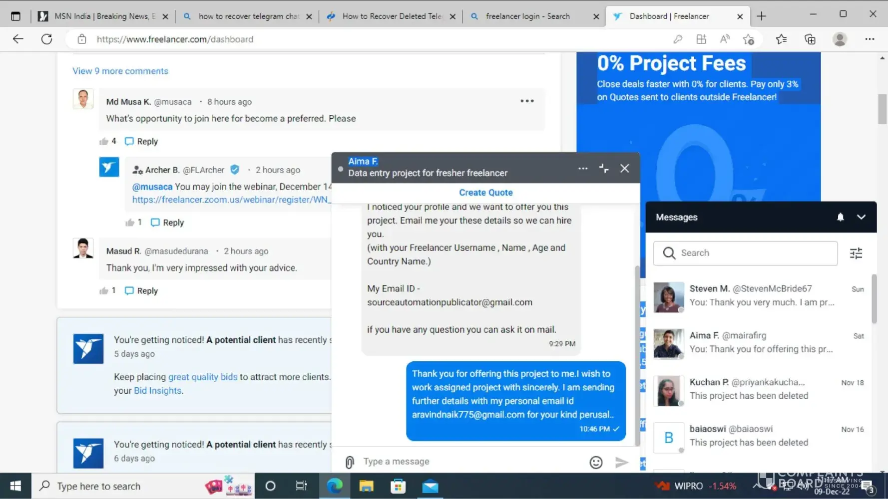 On September 1st, 2022, I noticed that I can’t log in and get a message saying my account was closed. Any user has the right to send an email to [protected]@freelancer.com and ask for a copy of his/her entire data. That is true with most companies such as Google, but in this case, not only did I not get a reply, but my account was closed.