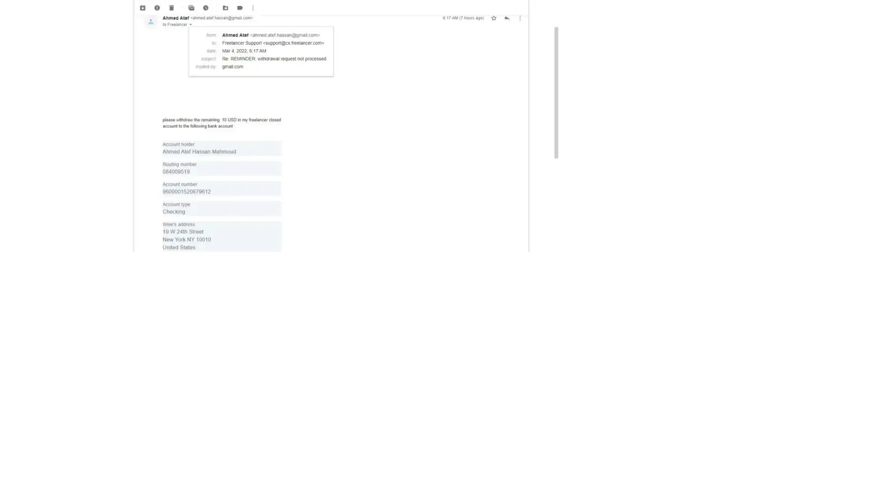 my account at freelancer.com with this email : ahmed.atef.[protected]@gmail.com is closed with sum of money 400$ in it , I could not withdraw them , I need a way to withdraw them to my bank account. I want to refund the 400$ in the closed freelancer account :ahmed.atef.[protected]@gmail.com to my US bank account with the following details :