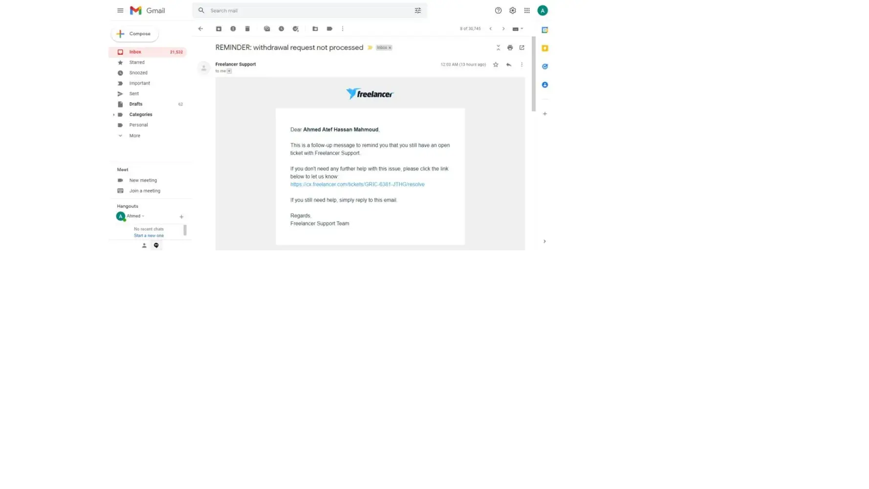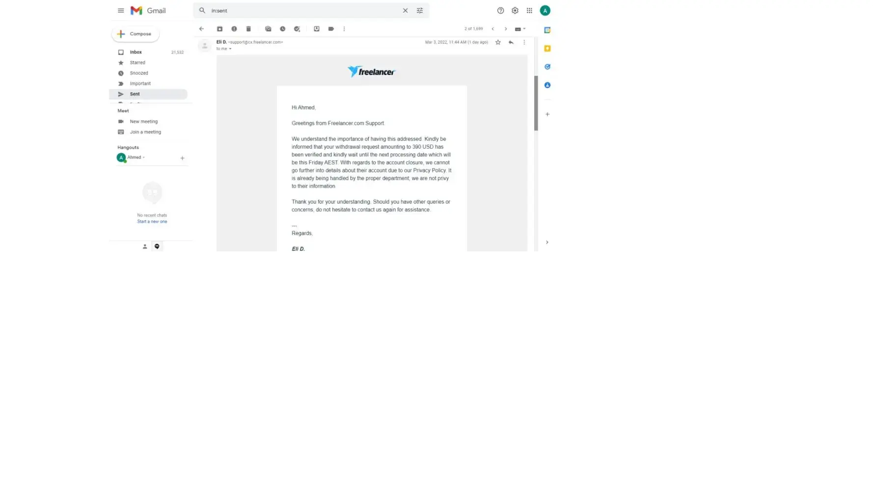 Freelancer.com Closure of account, account had 600$