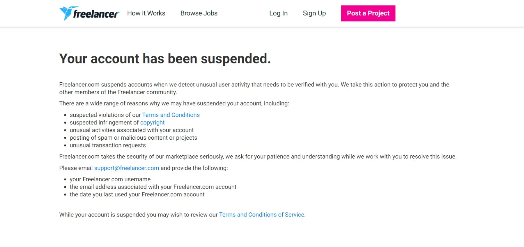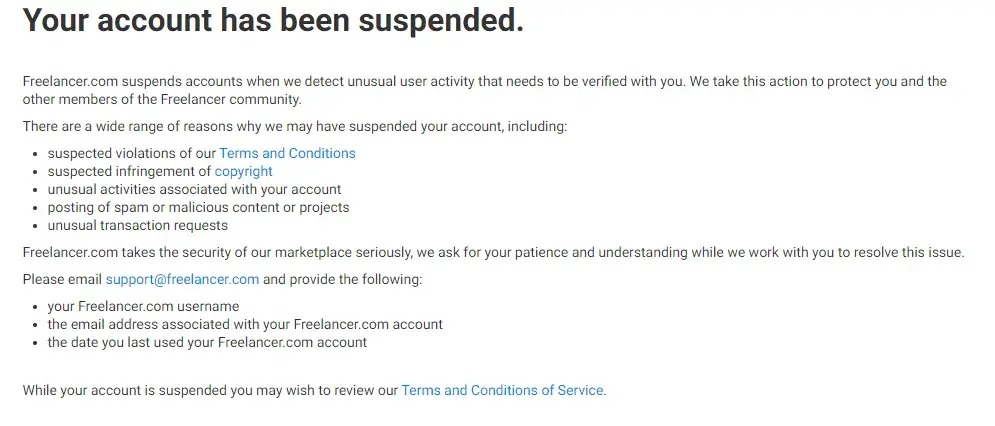 Freelancer.com My account has been suspended without any warning and without giving an exact reason why.