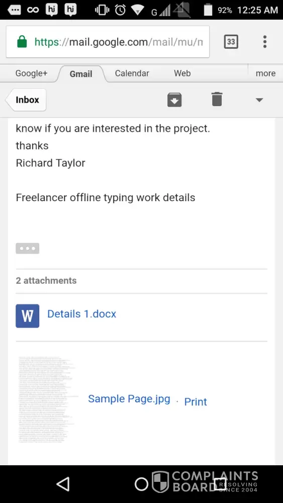 Same as it goes to me, plan p1, US$20 security deposit, 25 pages worth of data entry, exactly the same verbatim reason and the after one month the deposit will be refunded thing. Give the same website address. But this time around, he uses the name Richard Taylor with an email address: sunrisepublishers1@gmail.com