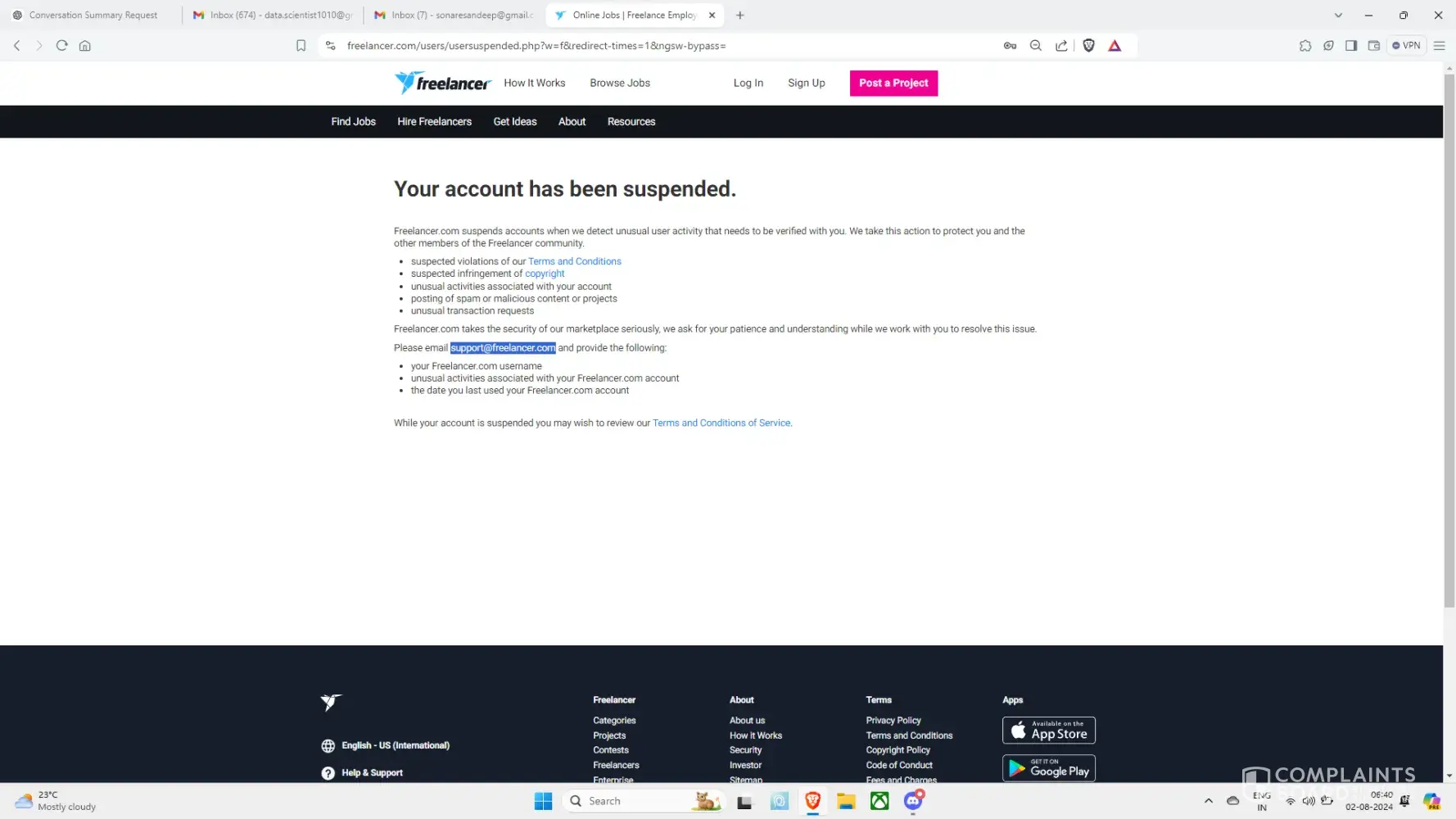 Freelancer.com suspends account aop