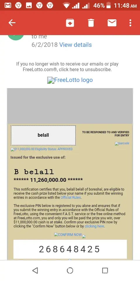 We are pleased to inform you about the release of the recent results of the free-lotto international email promotion program held on the 1st of january 2019. You were entered as dependent clients with: reference serial number:f2-003-036 and batch number fr/[protected]. Your email address attached to the ticket number: [protected] that draw the lucky winning number, which consequently won the daily new year jackpot in the first category in four parts. You have been approved for a payment of $2, 000, 000.00 (two million united states dollars) in cash credited to file reference number: tfr/[protected]/jpt.