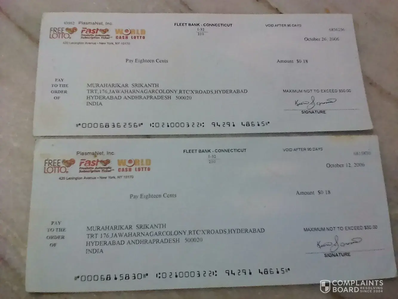 Hi, my self Srikanth from India, I want to tell you abo a check of $ 0.18 cents on date 12/10/2006 which I have not cleared by not knowing how to cash it out, and again a check of same amount as $ 0.18 cents this also I have not cashed, the free lott has not sended my winning amount check of 1 million dollars, ii have sended my detaiils through post office along with my id poof of my driiving lcence to their office but no reespponse to my letter and then I askeed thm tehrough maiil to their lotto address as freelotto.com, their reply that have not won any lotteryut the pending money of my winnngs fom the past 12 years, I have played the free lotto game for which my detaiils have been registered with the free lotto.com. At first the lotto site has sended me. For proof I am sendng the scaned copy of my two checks, I need my winning amount to be paid back to me as its almost 12 yerrs has been passed. my previoous email address reg with free lottoo.com is [protected]@yahoo.co.in now my present email adds is : [protected]@gmail.com