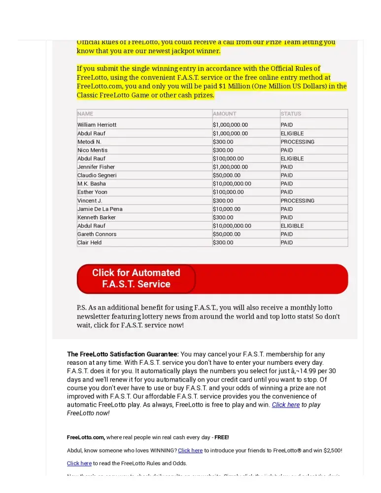 I started this free lotto when I open a site and freelotto.com appeared at the end of the site. I played it because it said it is free. every time i open it and play, it always convinced me to join the F.A.S.T. but i didn't do it because it asked for a payment. At first i really believe it. But when many e-mails sent to my address informing me that I won a prize, of course I really want to believe it specially that I really in need of money that time. A certificate has sent to me through email giving me $14 so I could only pay $0.99. Meaning, they're giving me a discount. I really want to believe this but as I ponder about it and read different comments about it, most of them are telling that this not true. But there are also some who said that you can really have the chance to win. I gave them my name and my address but still a prize is not given. If ever, this is so good to be true. I can be thankful if you will help me with this..