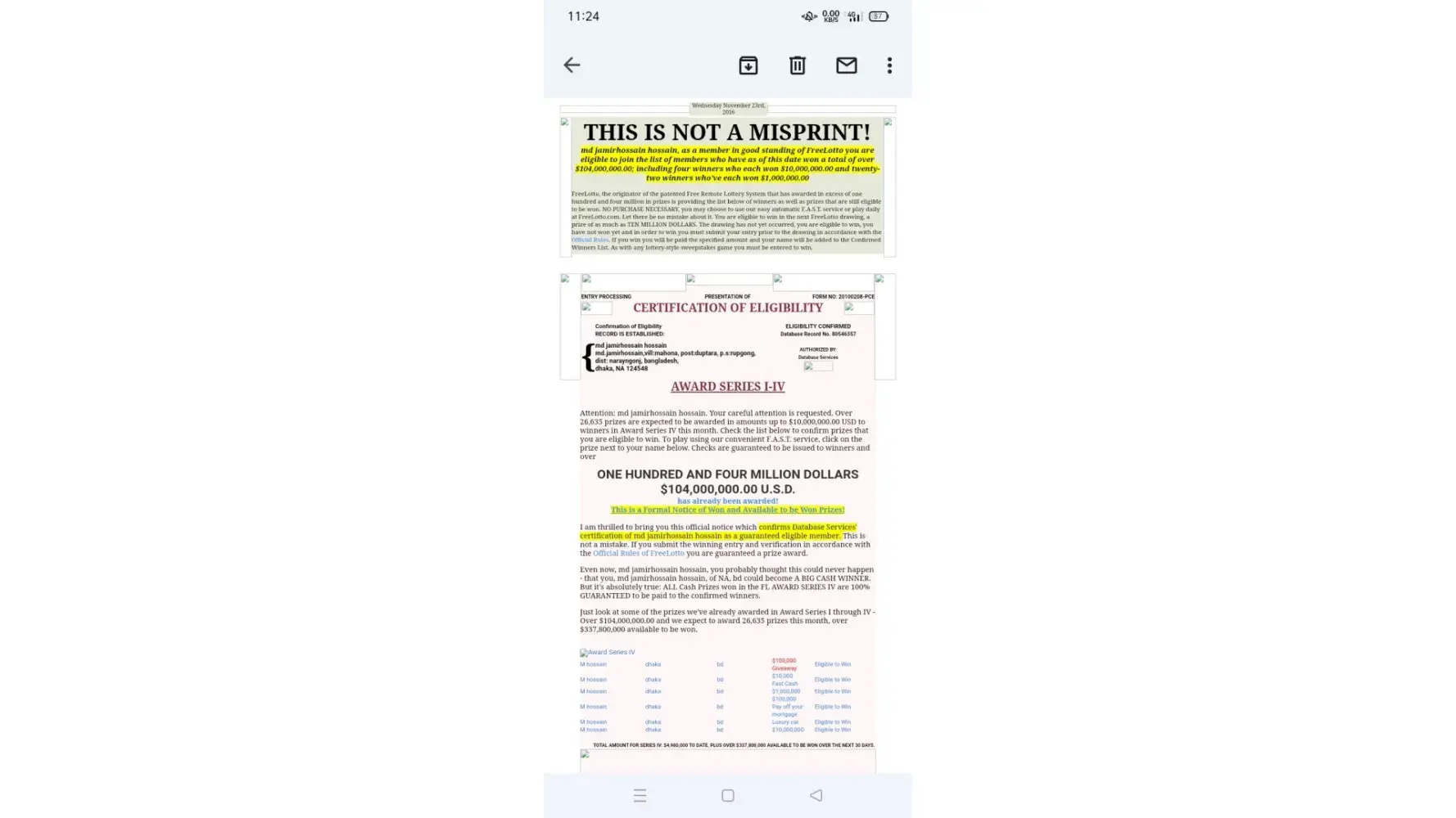 Dear sir,madam, my name is MD jamir hossain, I am big winner free lotto award series I,II,IV eligibility winner in free lotto, please check the list below to confirm prizes, database record no [protected] pin cord [protected]. eligibility winner free lotto date 11-23-2016, please check the my winners prizes, my email: jamirhossain816@gmail.com , thanks you