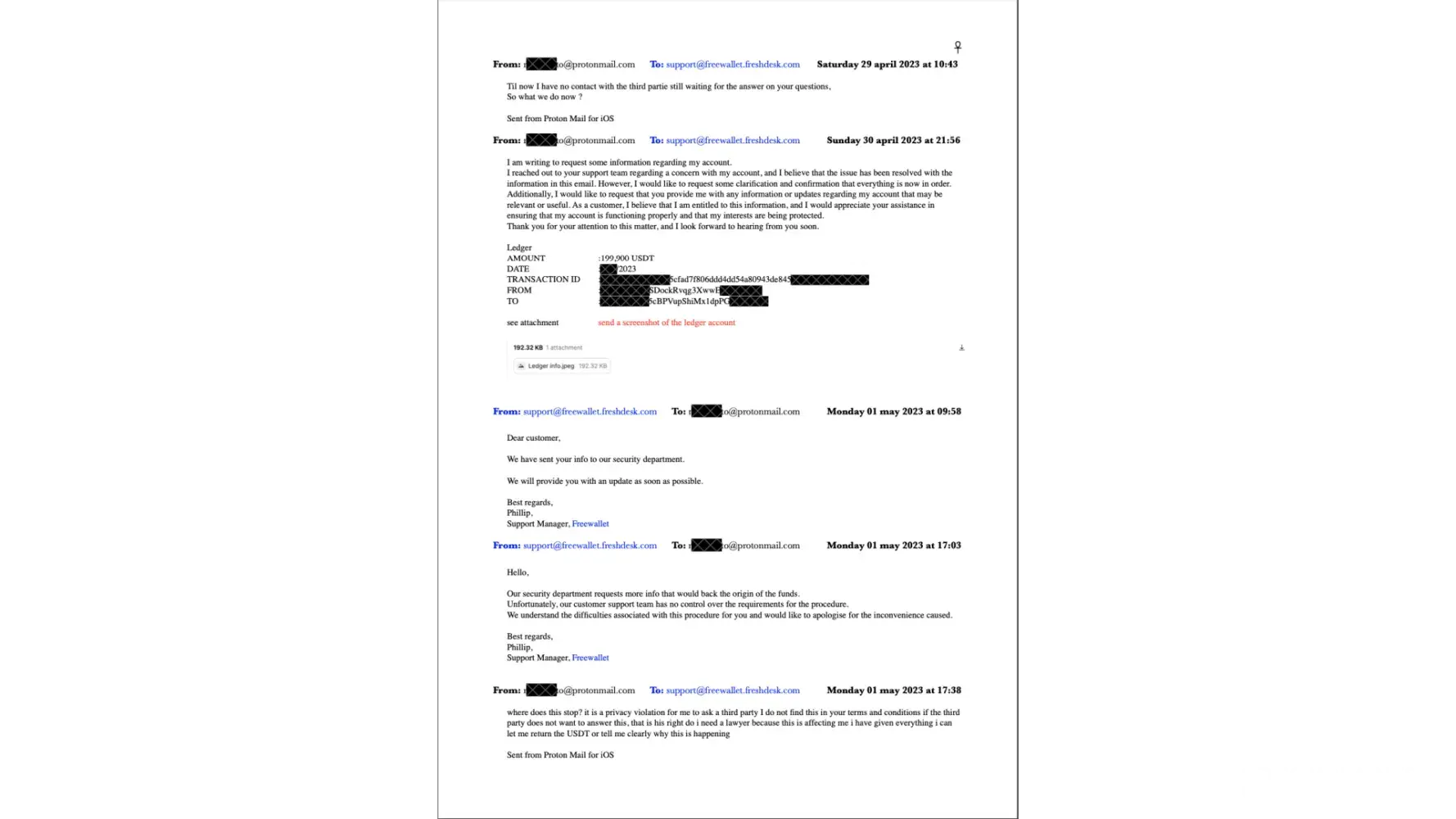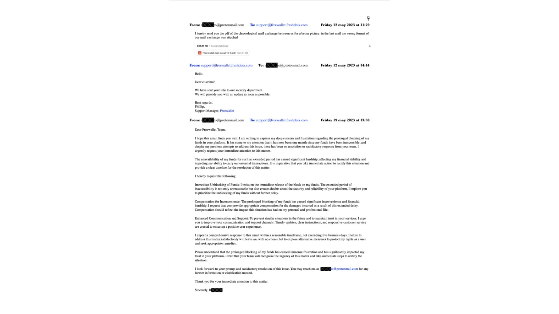 Since 20th April 2023, I have received 23 emails and sent 24 emails to support@freewallet.freshdesk.com. Until today, I haven't received any support ticket. Just now, on 4th July 2023, at 14:41, I emailed again, asking, "Can you give me a support ticket number for this case?" If you put in more effort, you could also find the case in the 10 screenshots that I have attached to this complaint.