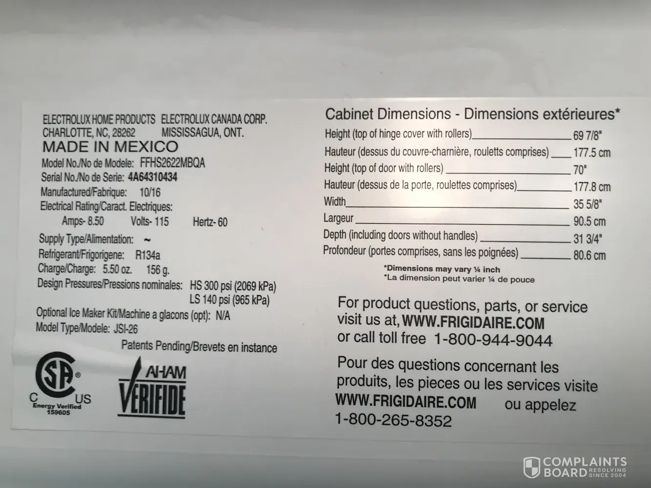 Deemed not repairable warranty (Warrantech) company did buy out. Giving only a fraction of the value of the frididare refrigerator. Stuck with a unit that does not work properly. Lemon item made in Mexico