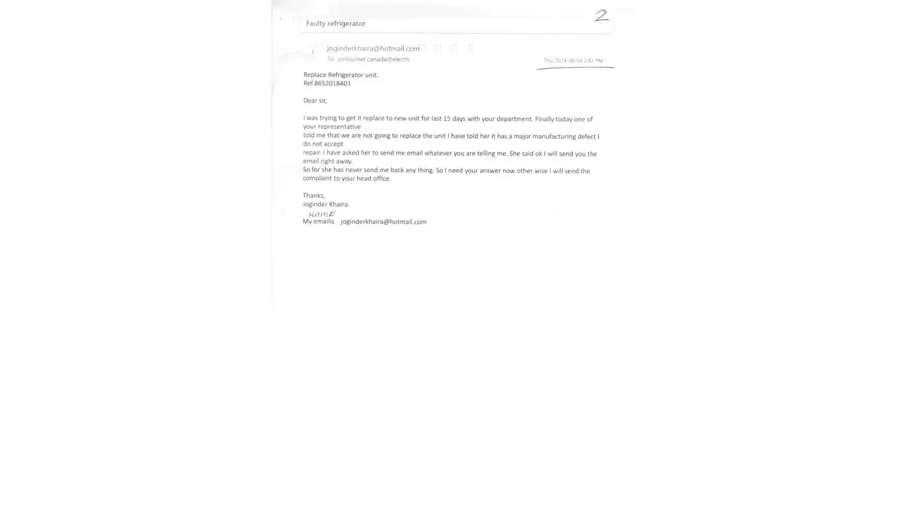Desired outcome: A replacement since the refrigerator I purchased from them is a lemon.