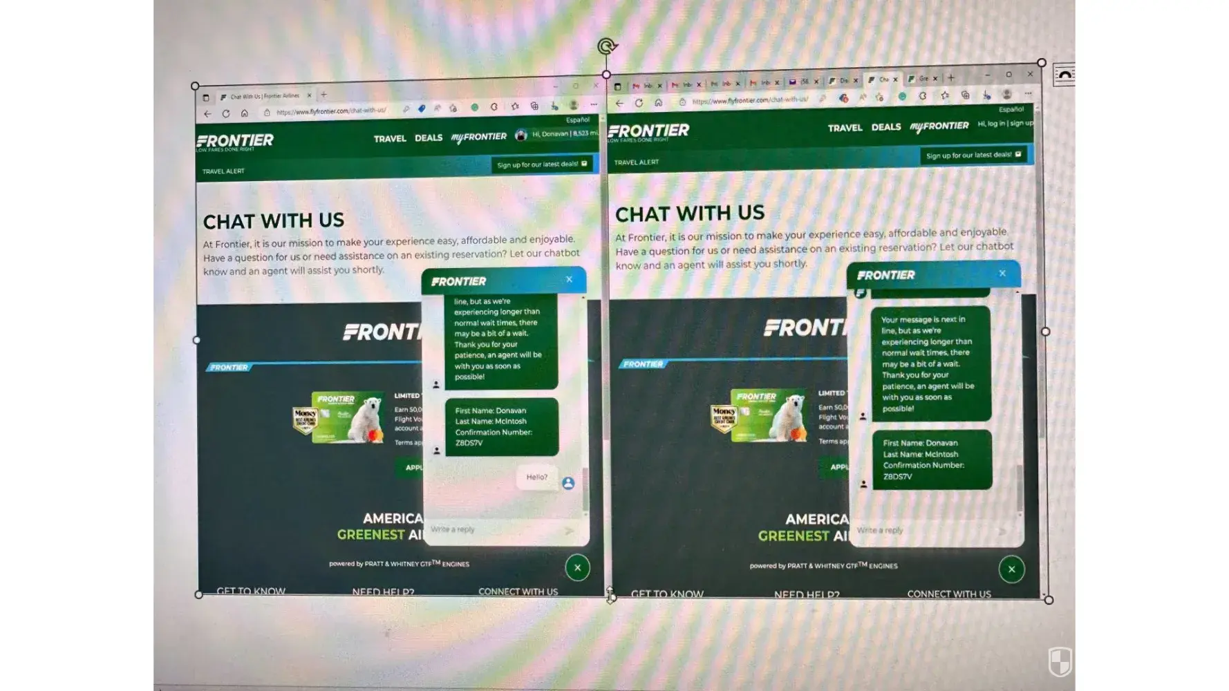 On Thursday, November 17, 2022, I arrived at the Harry Reid Airport, located in Las Vegas, Nevada, to make changes to my existing itinerary (Confirmation #Z8DS7V). While at the airport, I spoke to a customer service representative and advised him I had a last-minute scheduling dilemma and would need to modify my itinerary. At the conclusion of this 'brief' conversation, I was given a piece of paper bearing a phone number [protected]) to call to modify my travel arrangements. Furthermore, I was advised this was a 24/7 number I could call to help me. After calling this number without being able to speak to a live person, I learned customer service was only available during business hours and to log in to Frontier Airlines' "live chat." After waiting for over three hours, Carlos finally responded, asked a few questions, and discontinued the live chat while checking to see if the arrangements he suggested were feasible.