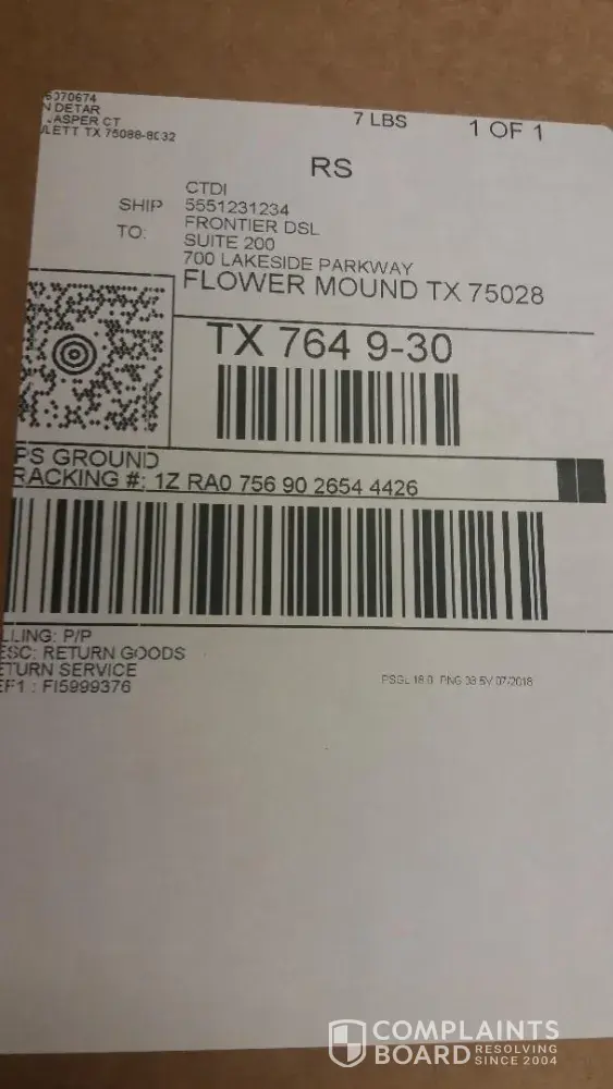 I packed everything in the box Frontier provided and took a photograph to document the contents. The requested equipment is plainly shown. At the recommendation of UPS, at the storefront, I also photographed the the UPS shipping label on the box. Returns to Frontier shipped on 8/17/2018. I will attach the photos and the billing.