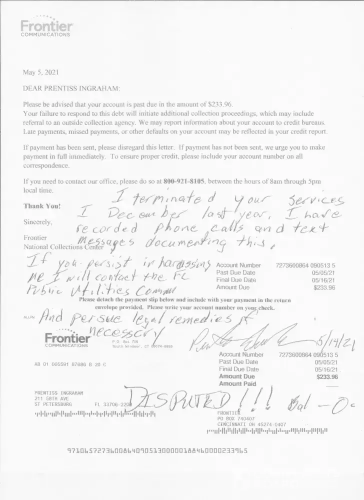 I am writing now because Frontier (and you) reported that old bill for [protected] ($487.61 see below) to the credit bureau, without considering the confusion the company created. That bill was "held-up" due to your billing department issues with the transition from Verizon. Paying two high bills for television created a hardship for me, even though I made a good faith payment of $75.00.