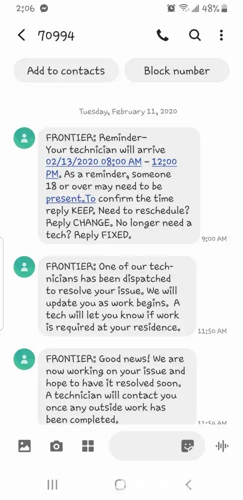 We were originally Verizon customers in 2010 through 2016. We were switched to Frontier in April 2016 when they acquired Verizon.