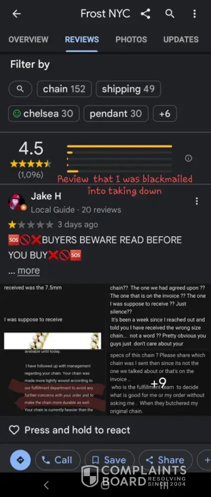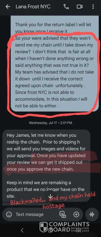 Once Frost got it back, they say they won’t start making my new chain until I update my review & that its store policy. BLATANTLY HOLDING MY CHAIN HOSTAGE UNTIL I CHANGE MY REVIEW! Since when did reviews become more important then customers getting what they PAID for & are promised? & what company has a policy where its ok to BLACKMAIL customers by holding their property hostage in exchange for updated reviews?