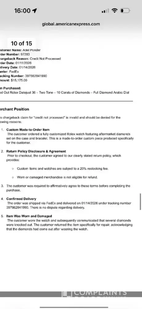 First and foremost, any company who thinks they can hold a customers product and their money and refuses to release until signing an agreement to 20% restocking fee is a company that I would not go near. I had purchased a rolex datejust 36mm and had it upgraded to 3ct bezel. I asked if they could price match an identical piece minus the sapphires and they told yes. Now the watch that is custom is the bezel which was suppose to be 3ct in white gold. I followed up on 12//12 and asked that I keep getting a run around about when it would be shipped I was promised 12//2019 it would be along with a tracking number. On 12//19 I was given a vague response and I decided to cancel my order which I emailed so I would have a paper trail. On 12//2019 I followed up on their sales chat box via website and she kept saying the manager will call me when I said I would like to know when my refund would be processed. I responded to sales rep who was trying to push the manager on me to call that I dont need to speak to him nor do I need to talk about a restocking fee for a product that hasnt been made or shipped. About 4 days, my product shows up with NO TRACKING NUMBER OR EMAIL WITH TRACKING DETAILS. Who would send a product without telling the customer and who would send a very expensive watch with no tracking number to the client. I cancelled 4 days prior to watch just showing up and I would have accepted it however the watch was incorrect. They made the custom bezel set in stainless steel and when I called the manager initially said thats what I ordered but I have SS of what I had ordered and it said white gold. Even the paid receipt said white gold bezel but appraisal said stainless steel. I send the watch back and even said I would let them fix it but I followed up with them the following day and told them I didnt want it and to return my funds as I had cancelled back on 12//2019. I want to remind you I still havent received even a response to that email and now this manager is stating its custom and we will charge you a 15% restocking fee. I said why would you charge me restocking fee when you ignored my request and made the product and shipped it without a tracking number or even an email. Basically they were trying to hide the fact they sent it out after my request to cancel. Now, they have my watch and my funds and are holding it hostage until I sign paperwork saying I agree to 20% restocking fee. Ill remind you it went from 15% to 20% and guess what is also wrong. The description on paperwork they want me to sign stating I agree to 20% restocking fee is has the incorrect bezel made of stainless steel and not gold which I paid for and is on my paid receipt. A company who holds both product and money who is forcing a customer to sign paperwork agreeing to 20% restocking fee which was changed from 15% previously, who set the diamonds and sapphires in the incorrect bezel metal, who tried to tell the customer he was wrong until I told him I had a screenshot, and then doesnt send even the secondary watch during the black friday sale, who has ignored all emails to cancel until 12//2019, has not once apoligized for lack of customer service, lack of communciation...I believe you get the point. Managers arguement is they were working on it for over a week now is complete garbage. A custom bezel is partially custom as in design or arrangement of diamonds and sapphires. It does not take that long. So unless they take raw sapphires and raw uncut diamonds, they just arrange the sapphires in a unique way. Once again, it was set in the wrong metal so the work they did would have to be undone anyways.
