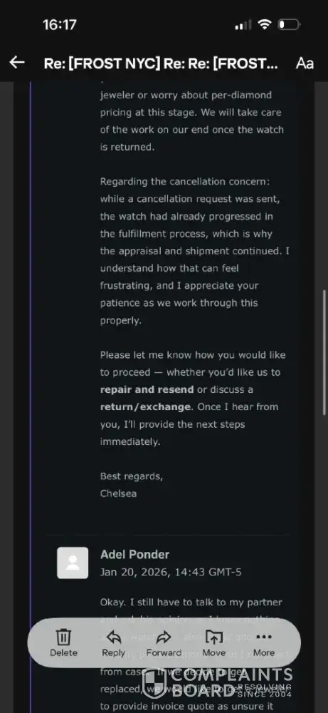 I sent my chain in to be repaired on 4.14.24. Frost ruined it & sent it back to me destroyed! Mirna apologized & sends me a return label to get it fixed