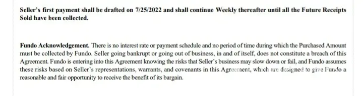 I have used Fundo several times with no issues. This time was different. I have always used the 10 week option never the 22 week as I feel the option takes to long to pay off. I was sent 5 different contracts on the day I was trying to sign my last agreement. As the representative I worked with kept messing up the terms the amount in which I asked for. Of course if I am getting this installment I have a emergency going on that impacts my business. So at some point I missed that the agreement was changed to 22 weeks. At this point I have paid every payment on time for 10 weeks and none of the balance is paid off. I still owe them the full borrowed. I will be seeking legal advice of how to deal with fundo further. I also had a collection agent call me back when my account is not even in collections. She was trying to intimidate me and telling me she would garnish me. Like I said I'm not even behind yet. Do not deal with this company they will not take ownership. Also I am the customer if I get upset and curse its okay I'm the customer I'm frustrated that your company tricked me. It really shows the lack of effort in staffing on your companies behalf that you allow your representatives to get sensitive when a customer is irate. De escalation classes would really help with your customer service. In no way should a customer service representative get a attitude back with a customer. You are there to calm down escalated customer and assist. The service I received was very unprofessional. Honestly I hate to use the terminology but it was ghetto. I would never expect such tone and demeanor from a business establishment. Stay far away!