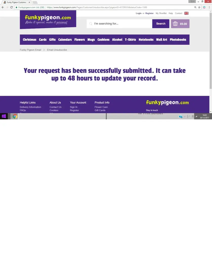 I've requested to be removed from the Funky Pigeon email list approximately 10 times by clicking the unsubscribe button and replying with the word "UNSUBSCRIBE" but this does not work. They continue to email daily and I do not want to receive these emails. I have contacted their Customer Services regarding this and they have not responded, they are violating the CAN-SPAM Act by not allowing me to opt out. I have attached an image showing my attempt to unsubscribe today but I have previously waited the required 48 hours after other attempts and this does not work.