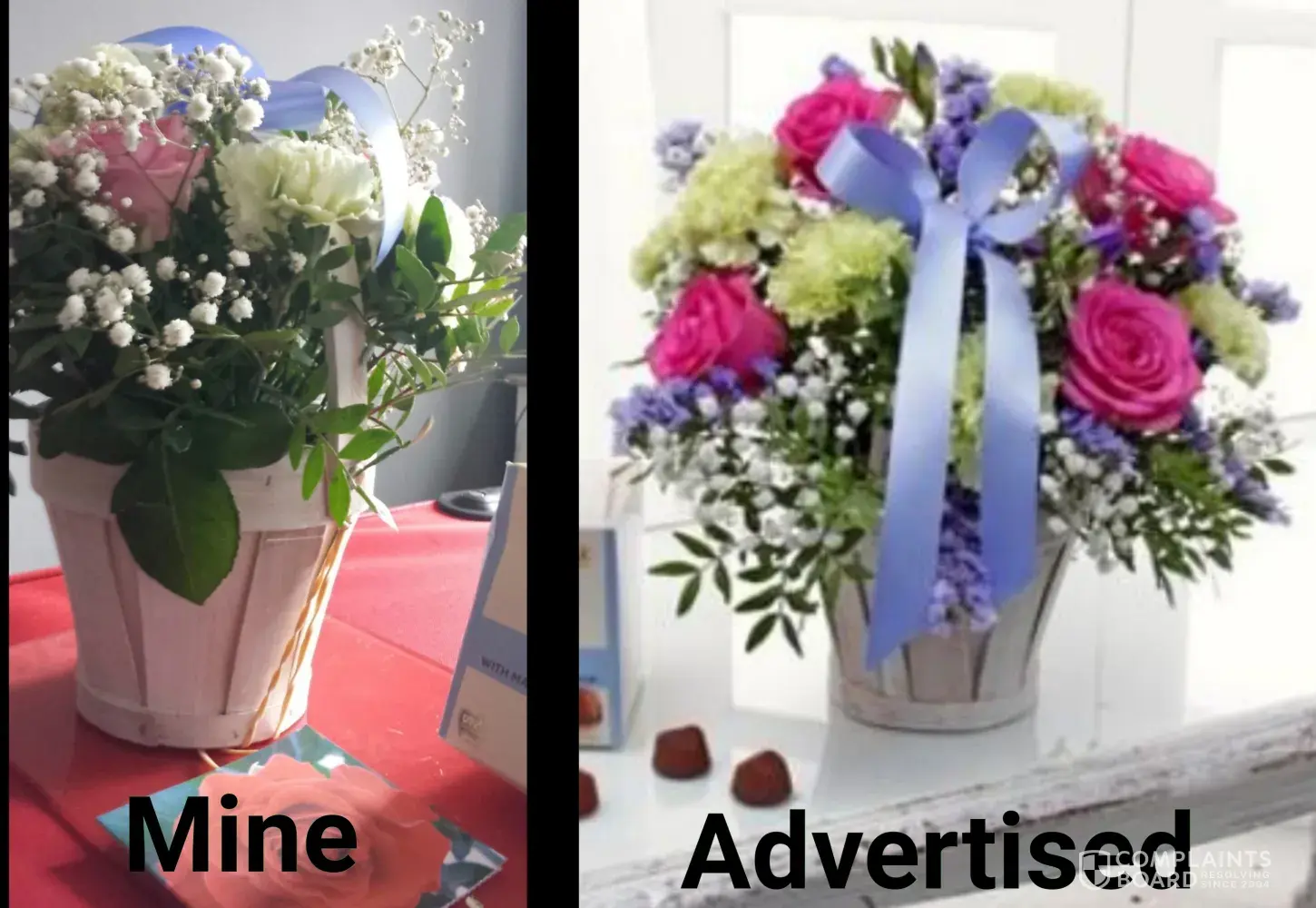 I was furious. The huge tall bunch of flowers advertised were nothing like the ones she received! Very small and about 1/2 the amount of flowers in the advertised pic. For a £40 bunch of flowers that is no way acceptable. I dont like to complain about somethi g that was free but the box containing the chocolates was squashed. Very poorly presented. I was completely embarresed by the gift my mum received from me. I even appologised to her (although she was still very grateful) saying i thought they would be a lot better. I am a regular customer to funky pigeon and have been for a long time but this is just not acceptable.