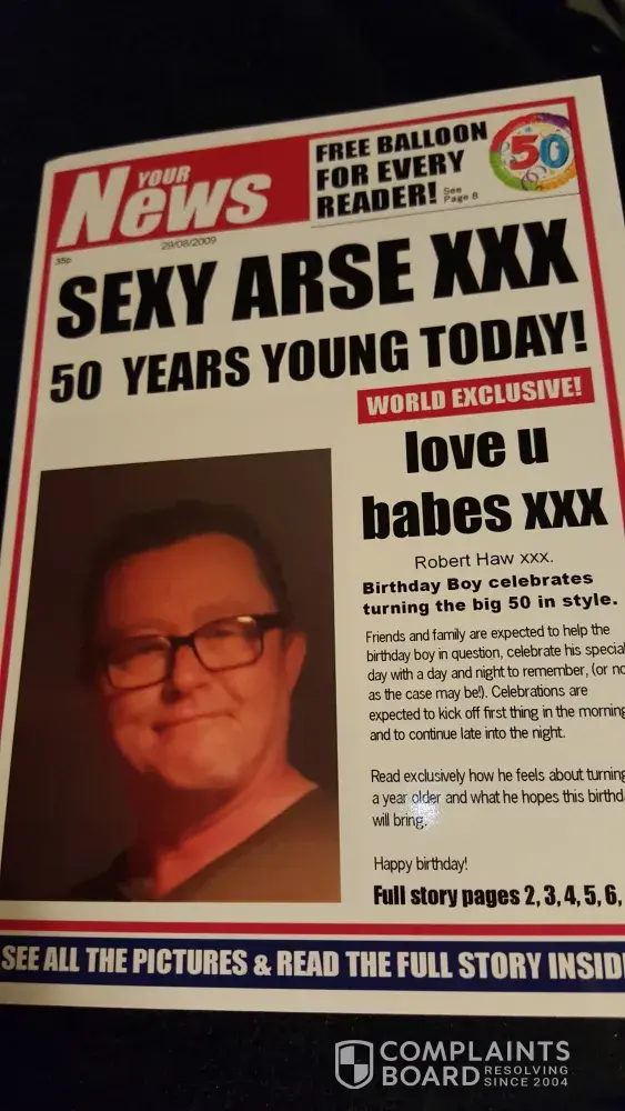 My husband's 50th birthday card arrived with no envelope and the uploaded picture inside is rediculas I'm not happy at all and I want my money back please .Leigh Ann birchall