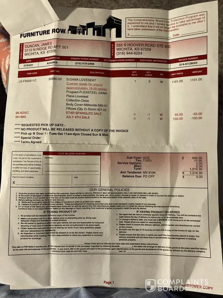 We originally went to Furniture Row around Dec 2020 because of their reputation, we thought maybe amidst the pandemic that it would be the most convenient and easy route to furniture shopping. And that is basically what our first experience was. We bought furniture set, took out a loan through Synchrony Bank with the intent of improving my credit score. As far as the process there was no major issues. The delivery date kept getting set back, but we had expected that because of the pandemic. The loan was paid off within 6 months. And the furniture was finally delivered in January 2021.