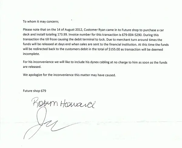 the total purchase was 170.00 plus...he paid 155.33 on debit and was going to pay the remaining in cash...the debit part went through (was taken out of his account have statement as proof)but the cash register apparently froze up and they cancelled the transaction before he was able to complete the cash transition of 17.99...they told him the debit payment will not be returned to his account until 24 hours...so they claim...in their little minds they cannot understand that they have his money and WILL NOT do anything about it...I know personally I have spent thousands of dollars there for electronics and I will NEVER buy so much as a piece of paper there again! The CSR Robyn and Manager Matt were completely and utterly useless and made light of it as it was no big deal because it will be sent back to his account within 24 hours (how do we know this for sure?)we won`t know until 24 hours!Then to top it off they insult us even more by offering him a dam 10.00 dynex cable for at no charge to him as soon as the funds are released? Like really? WTF?I`m scanning the paper I had to make them fill out as proof that this happened...I`ve worked in retail for most of my life and have never dealt with such incompentance in my life!At the end they send us out the door like ...sorry...too bad...oh well...and when we told them we would make sure everyone would be informed of this, and that we would never do bussiness there again...they were like "oh well thats your choice"...in this day and age where every penny we earn is vital they don`t seem very concerned with loosing and customers...well i guarantee they lost quite a few over this little game they are playing...and if its not in his account tomorrow the NGPD will be contacted and charges for theft will be laid!...Thanks for the rant and once again please be very careful and think twice before doing any bussiness with FUTURE SHOP NEW GLASGOW STORE 679