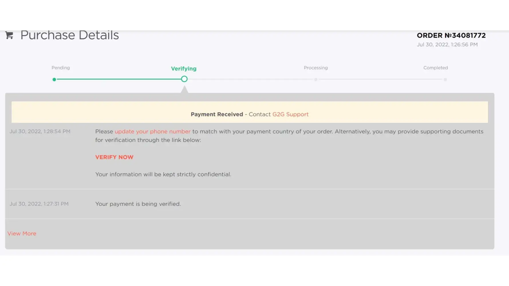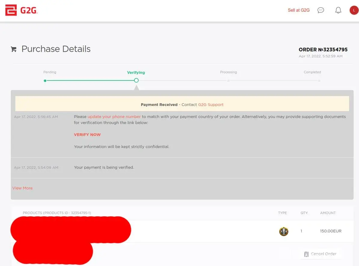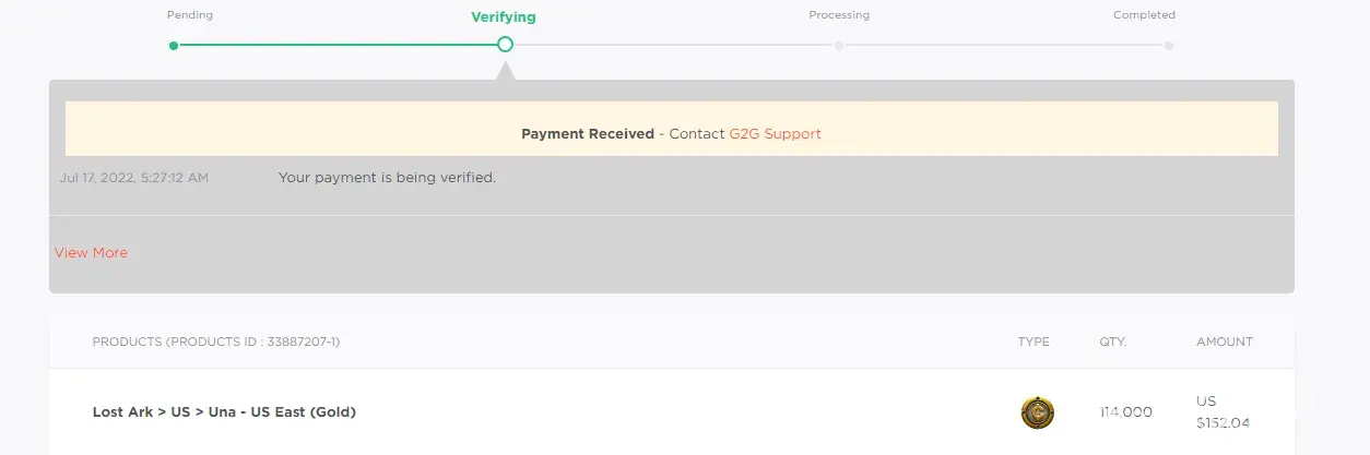 I purchased $50 worth of gold for Lost Ark yesterday, 8/1/2022. After a few minutes, my order updated to the verification process. At first I thought it was something G2G had to do on their end, until I saw the verify link. I followed the link, scanned and upload pictures of all documents required, and everything says verified in my account. However, my order has still not updated. I tried submitting a ticket, but they immediately closed it. I reopened it, updated a few bits of information on it, and have still yet to receive any form of response. Definitely starting to get a little worried, as there are tons of mixed reviews. Please, let me know what is going on so I can either get my currency or just refund the order altogether.