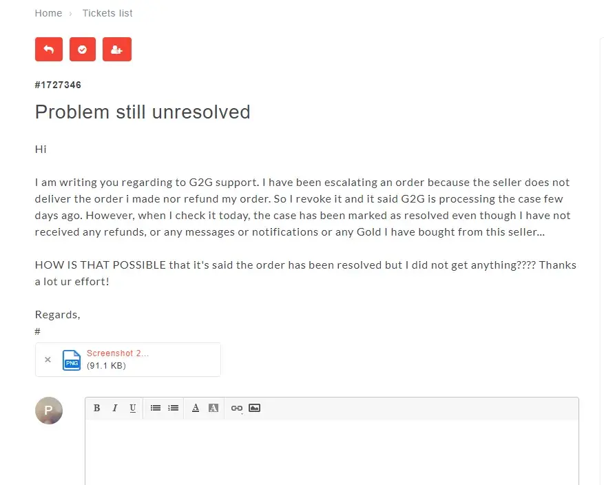 I have ordered some currencies in G2G on the 7th of June 2022. The sellers only delivered 2 out of 3 orders within 24 hours and 1 order never arrived. I tried to contact the seller in the first place and they kept on ignoring my message or telling me that they will deliver the oder. I have warned them that if they don't deliver it, I would have to report it to G2G but despite the warning, the seller never delivered my order. Until the 10th of June, I have enough of it and reported the incomplete order to G2G to have a look at the issue. However, after 3 days, the order was marked as solved / complete (without any reply from G2G or any notifications) even though I have not received any currency I have ordered nor did I get any refund (as I requested in the complaint). I sent a ticket after realizing it but after 3 days, even though it was passed on many employees, no one even bothers to send any replies or updates on my issue. That's why I have decided to reach out to this complaint platform!