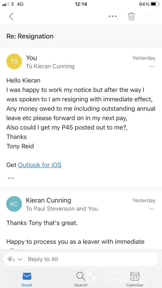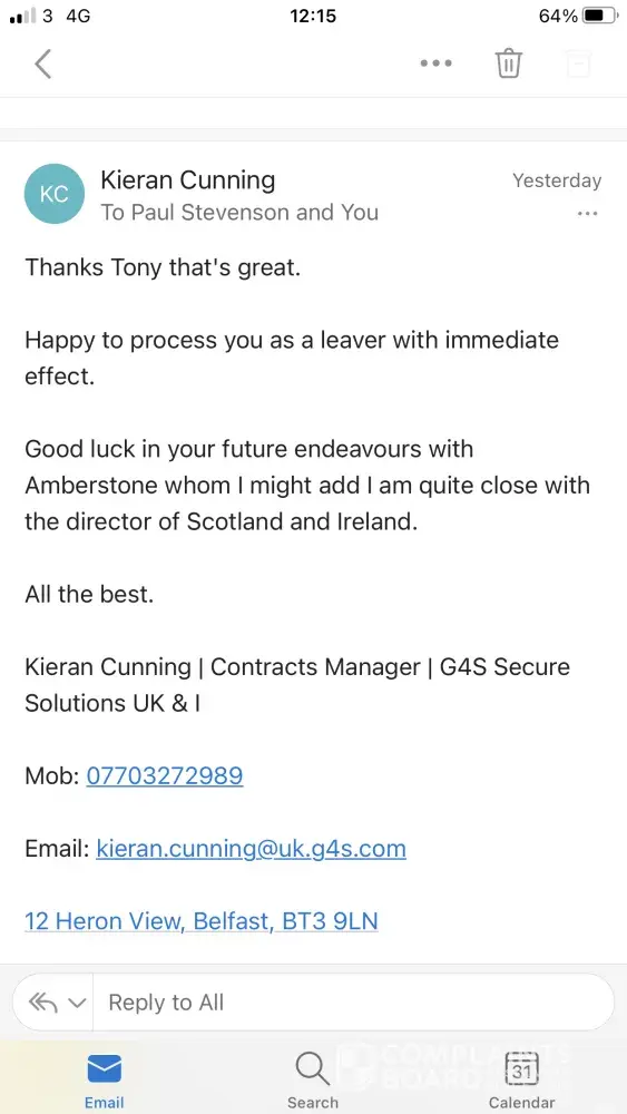 My name is Anthony Reid I have been working with G4s for 6 years & I would like to put in an official complaint on my Line Manager Kieran Cunning,
