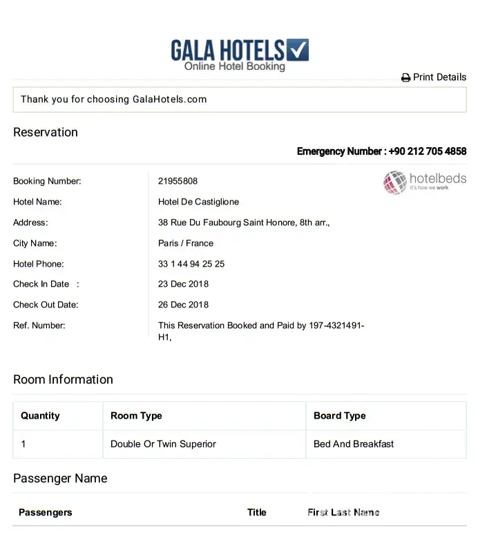 Paid for the first one in june 2018 and the next in august 2018 the bookings covered a stay from jan the 3 untill marts the 1st. Arriving. At the hotel with all my papers I was told that the hotel had not got the money from Gala hotels so I had to pay again the total amount for my stay.Have send several mails to GH but all they tell me is that they will, look at my case.