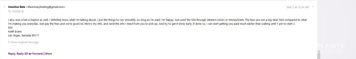 There is a scam artist named Keith Evans (Las Vegas, Nevada 89117; [protected]) who claims to make you money every day from his "sports betting expertise" operating a sports betting service called "Intuitive Bets" (www.themoneylineking.wix.com/intuitivebets). He advertises his service all over Craigslist and CLAIMS TO HAVE A 90% WIN RATE. When he wins, you...