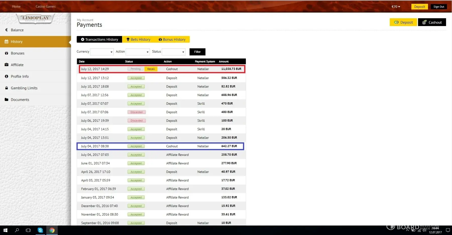 Hello guys, I'd like to warn you all about brands connected with Bro Affiliates: LimoPlay, Betchan, Play.Casino (owned by Direx NV). I'm their player and affiliates (the same account). I have never had issue with playing, payments, deposits, etc. till now. Yesterday I decided to make a deposit and play as usual. I was lucky this day and won 11, 038.73...