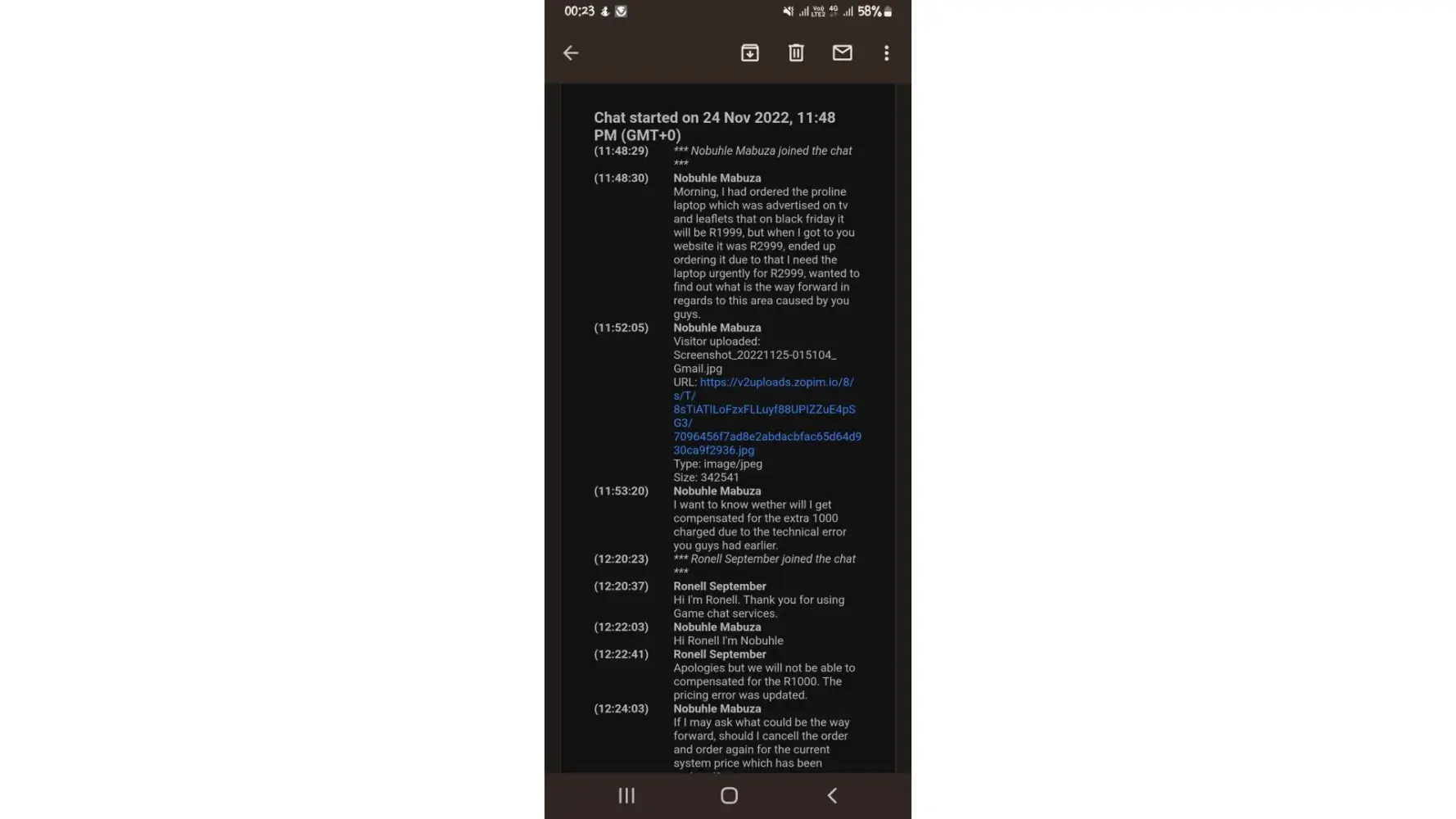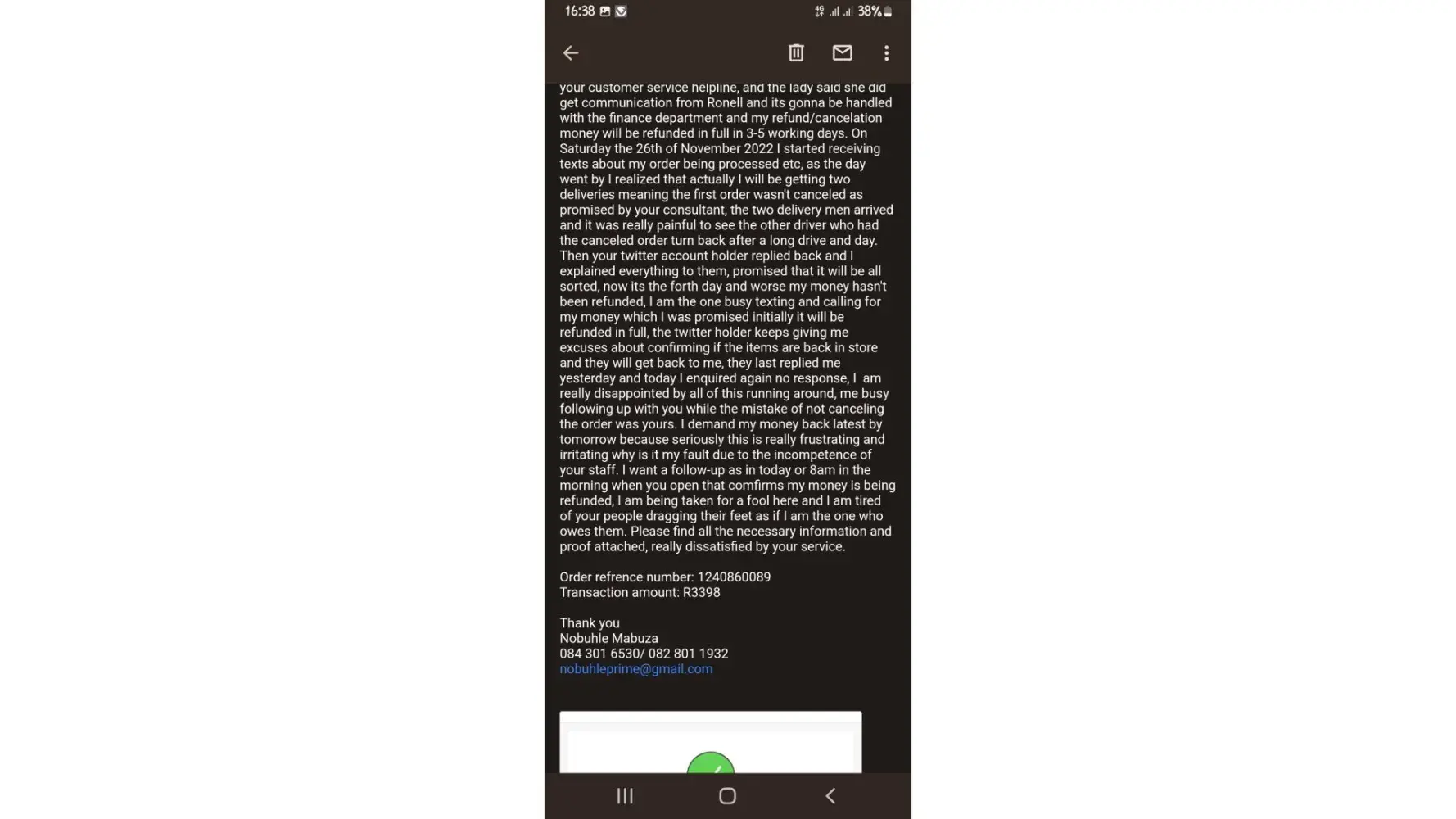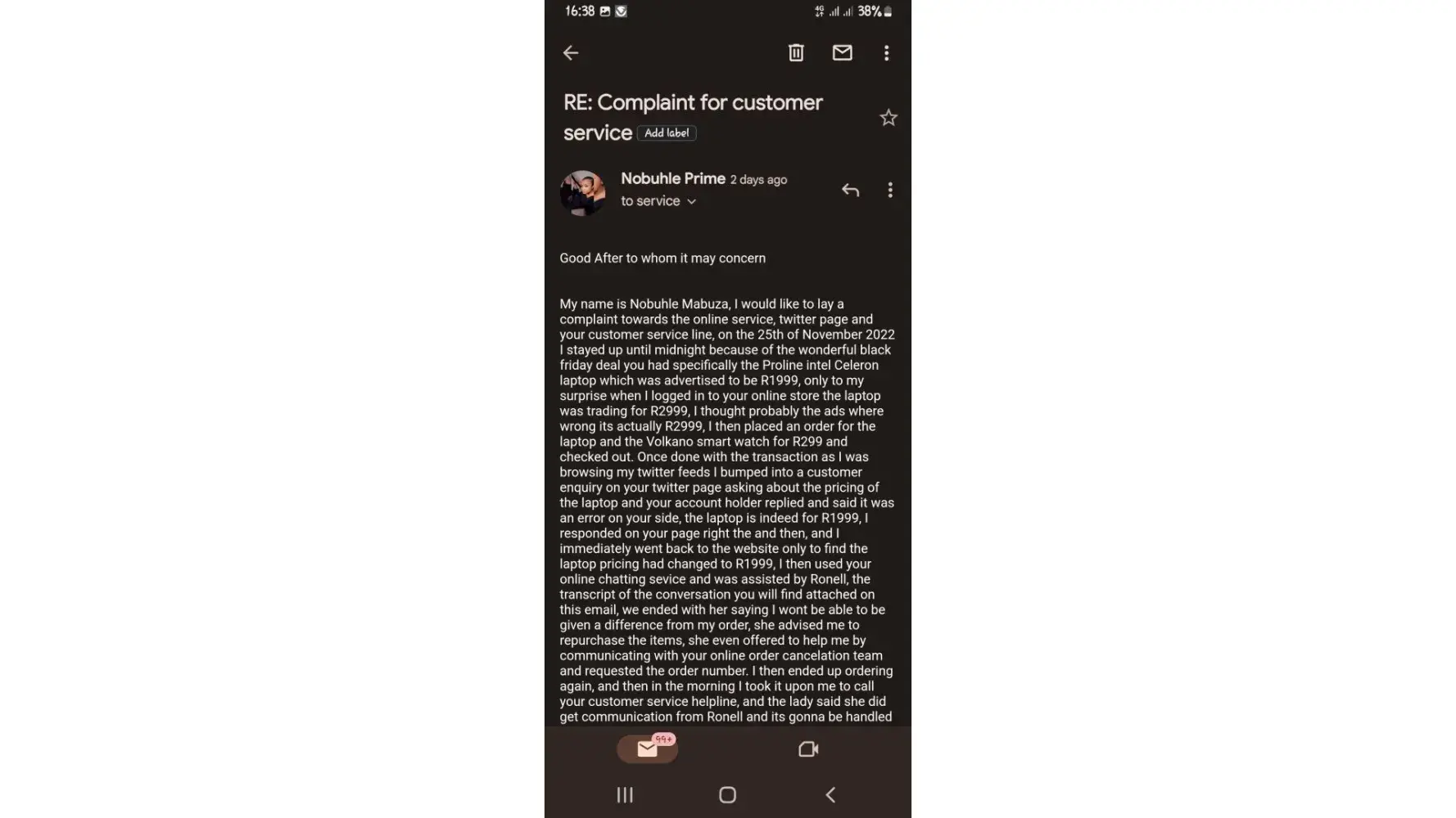 On friday the 25th/11/2022 around past 12am I did an online purchase for their black friday deals, the was a promo on the Proline intel Celeron laptop for R1999 which had been advertised throughout the week, then on Friday as I logged onto their online store the laptop was selling for R2999, I then thought maybe the advertisements where in correct, I placed the order for the laptop and a volkano smart watch, which in total it amounted to R3398.00 then I checked out. As I was browsing through Twitter I saw a post by a customer enquiring about the price of the laptop and their Twitter account holder responded saying it was a technical error, I then went back online and used the wen chat service and the person assisting me adviced me that I should cancel the order and reorder for the current price of R1999, I reorder the items then in the morning around 8am I called their customer support line and asked that the first order for R2999 including the watch to be canceled the Consultant then ended our conversation with that she has canceled the order and will send the request to the finance department and my money will reflect within 3-5 working days. Then on the 26th of November 2022, I got a sms's saying my order is on the way, to my surprise when the I was notified to come outside and collect my order, I had two deliveries meaning that the first order I had made and requested to be canceled wasn't cancelled, I then rejected that order and signfor the one I did after the first order, Sunday the following day I started communicating with their Twitter account hold and they asked for proof of payment and refrence number for the order I provided all of that then they said they need to comfirm with store/warehouse wether the items have been brought back to them, I texted on Monday, and Tuesday again but no response, been calling also trying to findout how far are their in terms of my refund, all the consultants I spoke to they give me the "we have to check with the store/warehouse to comfirm for the items that they have them" and some have promised to call me back none have called back, even the 29th I wrote them an email in regard to this matter, the email has not been responded too, today after calling and being told that they still want to confirm with the store/warehouse the consultant asked that I call again after +/- 30mins I called again the consultant I got this time, called the store/warehouse to comfirm even the call lasted for 30mins because I was told to keep holding and finally the part of the warehouse was solved but the real issue now is that I am being told that they have a procedure where paperworks pass from head office to the warehouse back to head office the back to the consultants then the finance department and I can only be refunded after 3-5 working days and I explained to the consultant that I am not willing to wait thay long again due to that my refund was supposed to be already done had the order had been canceled on Friday (25th/11/22) and the consultant said they will try and see if that I can get my refund back either today or tomorrow.