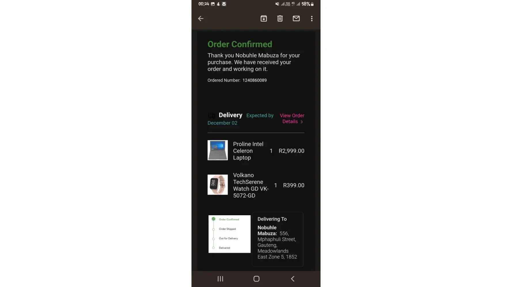 I, on the 25th of November 2022, ordered a Xbox Series S from Game (R5999.99) as a join birthday present for my 9 year old brother. As per Game's website (https://www.game.co.za/Electronics-%2526-Entertainment/Gaming/Consoles/p/000000000000818531) the Xbox was supposed to arrive on the 2nd of December 2022. I received an order confirmation email clearly stating the package would arrive "by December 02".