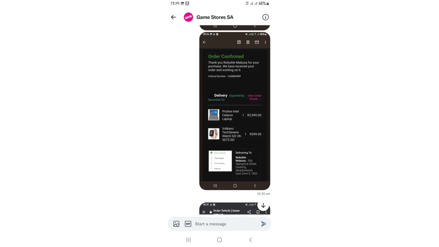 I bought a treadmill at Game Canal Walk on Sunday 27 November and was promised that it would be delivered yesterday 29 November. On Monday i received this message.