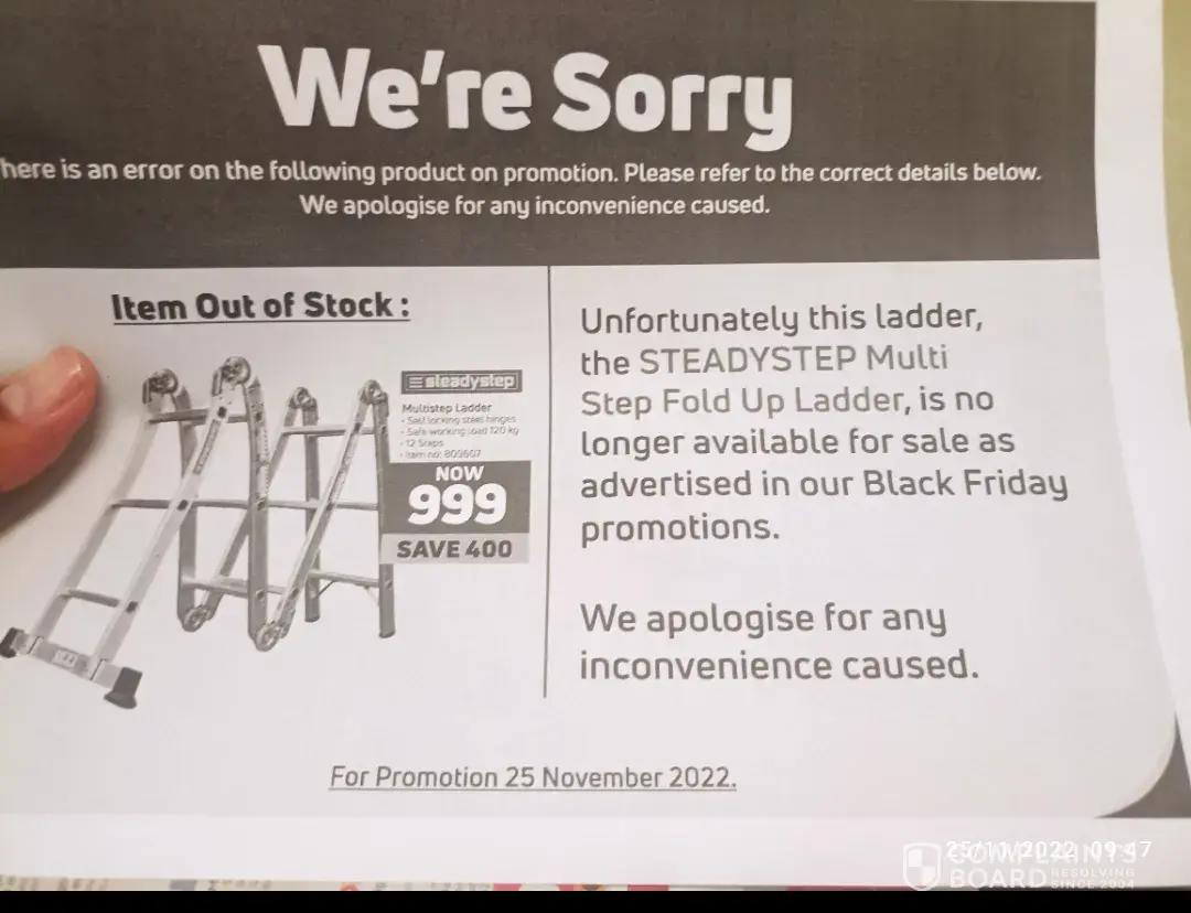 This is a complaint regarding the attached multi step ladder advertised on Black Friday for R 999 item number 809607.