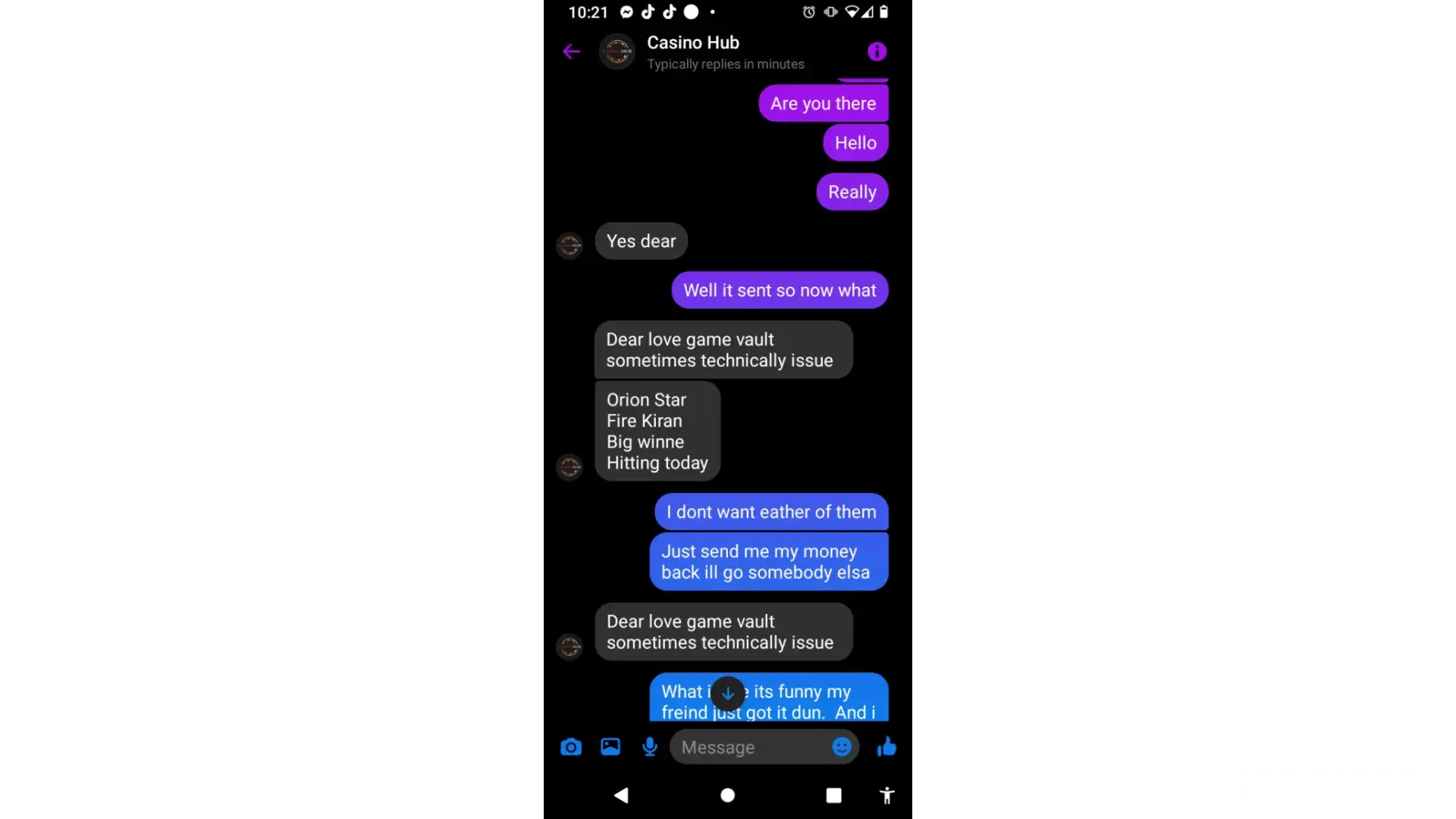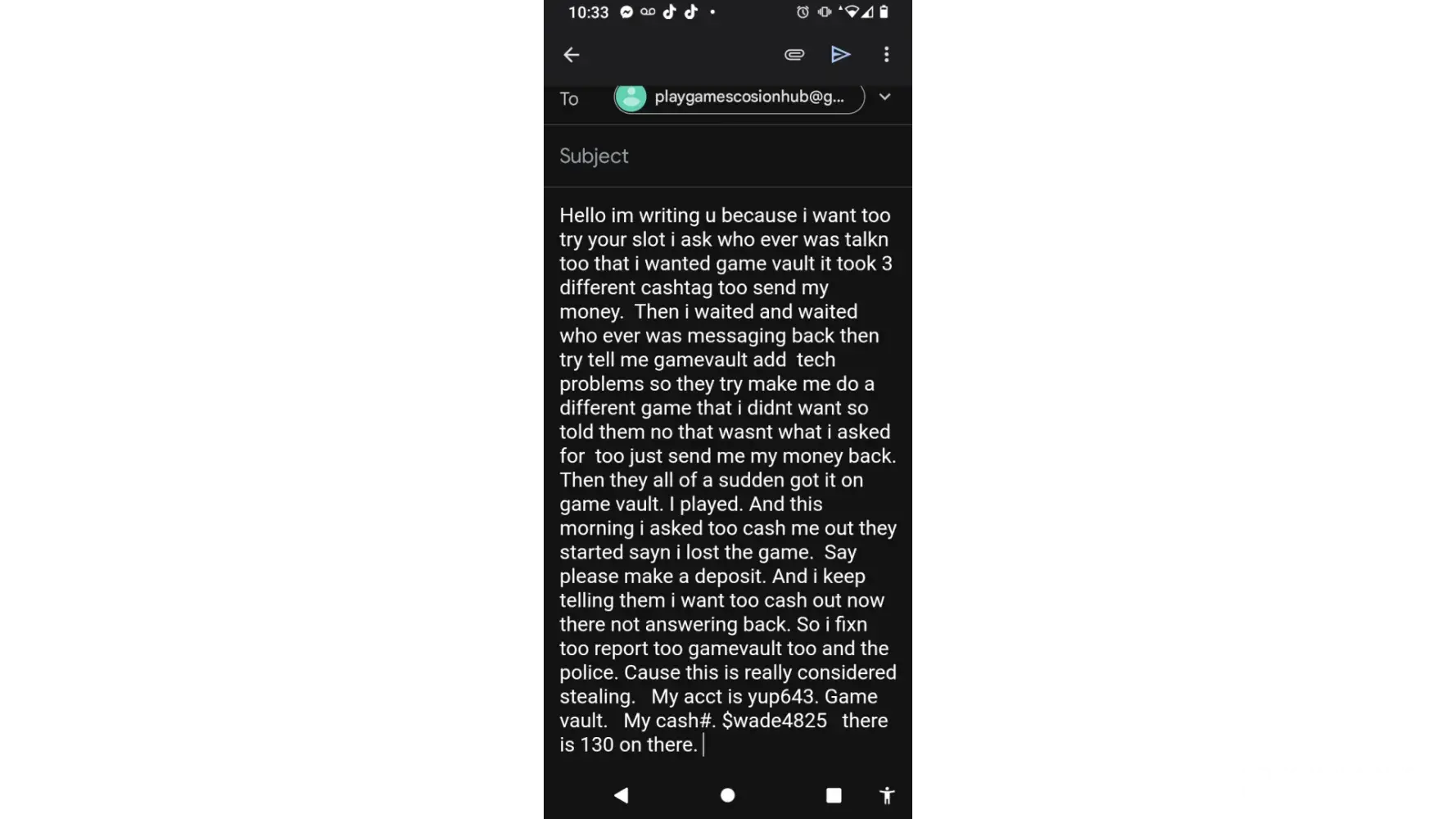 Desired outcome: Please update my balance and address the technical issue in the game so that it doesn’t happen anymore. As well as consider how the money it’s stolen prior. My user name is blinvault.