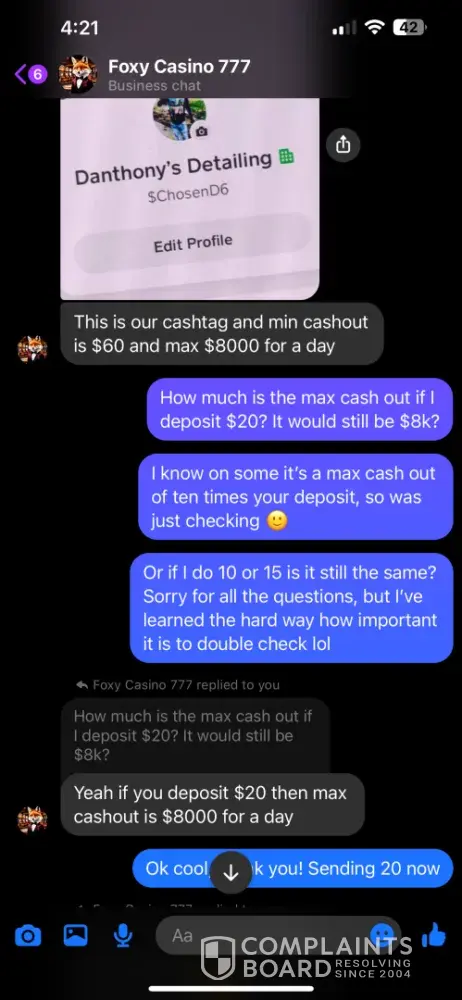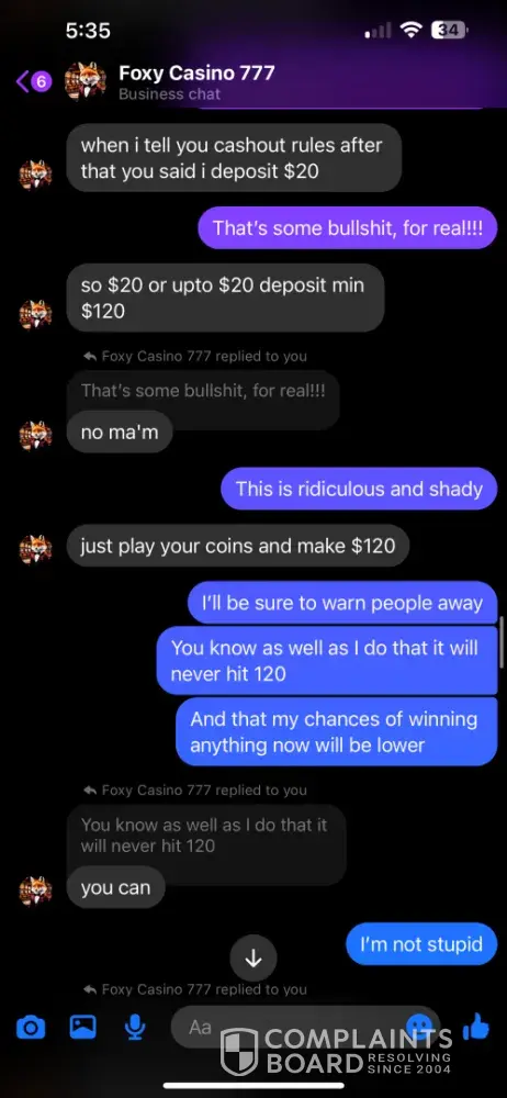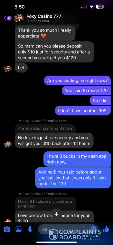 I signed up under Foxy Casino 777 through a Facebook post. I specifically asked for the minimum/maximum cash out amounts and was told 60 minimum/$8k max. I asked for a $20 deposit if it would have the same cash out, but didn’t think to ask about the minimum. So I was at $70 and tried to cash out. I was told the minimum was 120, but if I sent another 20, I could have the 70 and would be able to cash out the 20 within 12 hours. I told them I didn’t understand why I should have to make another deposit, so I tried my luck at reaching the 120 and did. I got it up to $250, which is well over the 120 minimum, I told them I wanted to cash out 120, would do a $60 tip and wished to leave the rest on the game. I was then told again that another deposit was required to receive my cash out. We went back and forth until he agreed to accept the last $3 I had in my cash app, but had to promise to send another $7 when I received the cash out. So I sent it, and still have received nothing. I was told that they were not a platform, but a “family†and that they are not scammers….