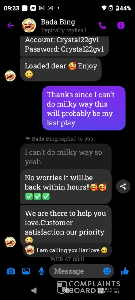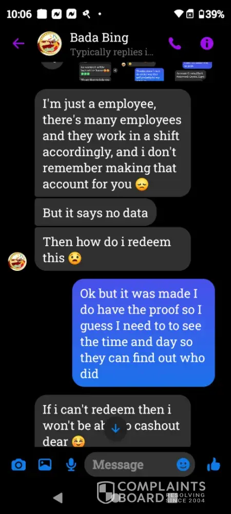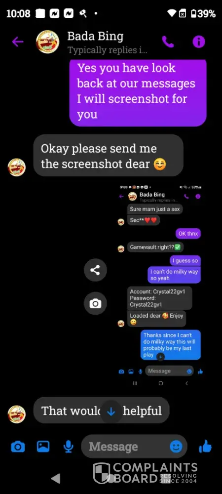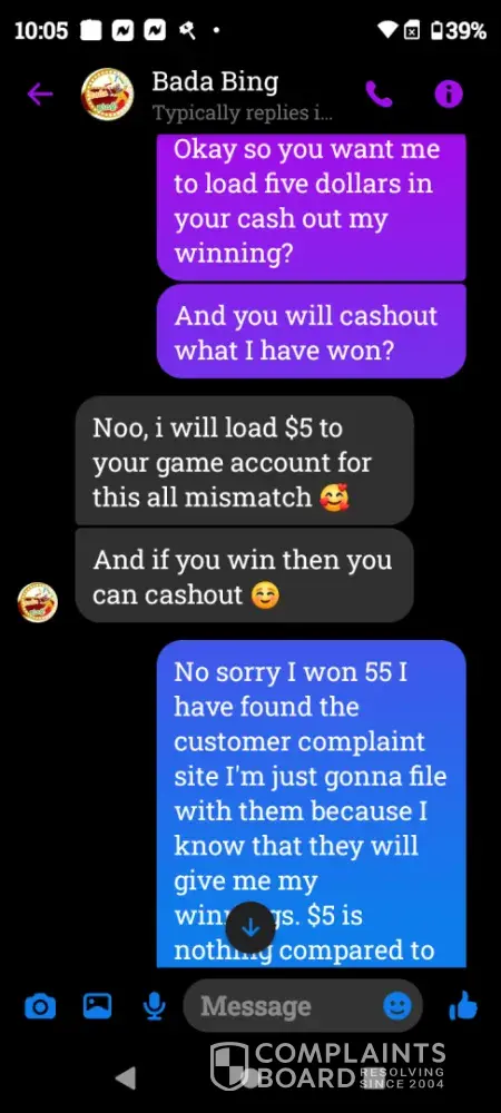 On Wednesday February 21st a gamevault account was set up for me using Bada Bing my username Crystal22gv1. Today Saturday February 24th I played and won $55 I sent my platform information letting them know I was ready to cashout and the informed me they did not set up that account for me however I screen shot our previous correspondence and sent it to them yet they continued to deny setting up my account. Later in conversation they offered to load $5 for my inconvenience which I declined. Because there was no resolution in this matter I chose to reach out to you guys. I have screenshots of all of our correspondence as well as a screenshot of my winnings if you need it. I thank you in advance for you attention to this matter and look forward to working with you in an effort to resolve this matter.