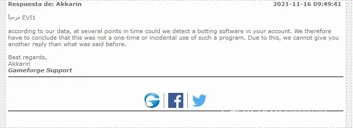 I have been banned due to direct result of the use of external software that automates fully / parts of the game (= so-called "botting software"). according to them, when I ask for actual proof they response was according to their system, which I'm sure it's incorrect. that been said I've want a way to complain or showing me actual proof for my case if it's actually there.