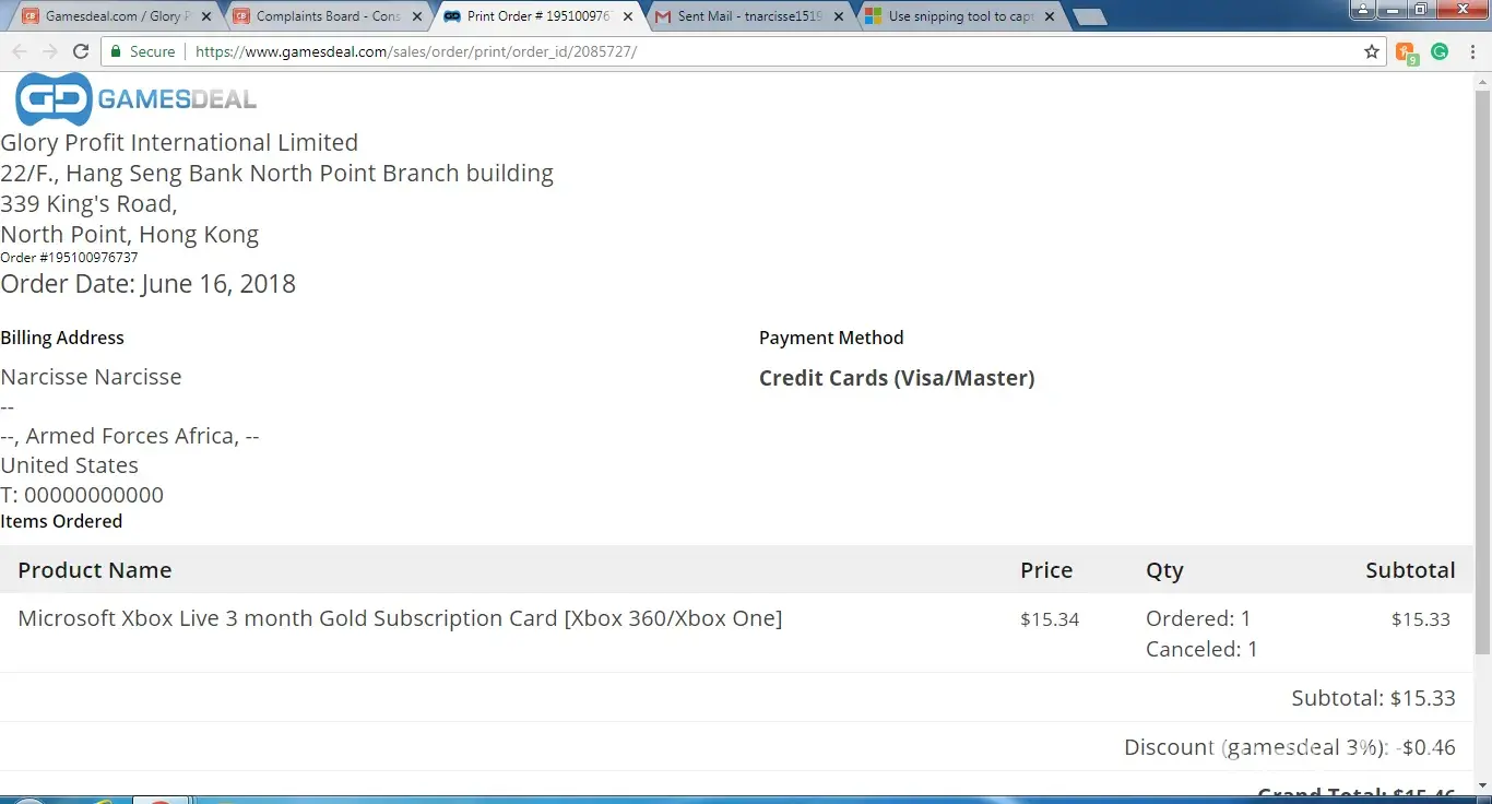 I ordered an Xbox live gold membership for 3 months from Gamesdeal.com. The order number was #[protected]. After I ordered it, I went to check my email for a message confirming my order. There was no message. Then I went on their website to check the status of my order. It said "NONE". I finally found a link on my gamesdeal.com account that allowed me to see my order. I was surprised and confused by what I saw. Under the billing address, it read: