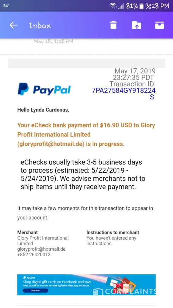 I live in Australia and have not purchased anything from Glory Profit International Ltd