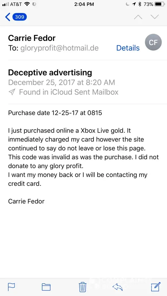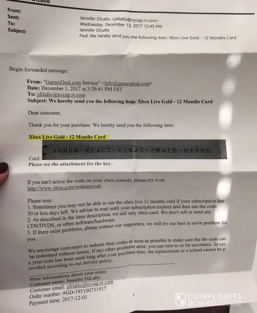 Purchase date 12-25-17, gamesdeal.com for a Xbox live gold subscription for a total $48.41 paid through PayPal with my Discover card. I received a confirmation of Glory Profit with a digital code which did not work. There was an email on the bottom of my confirmation with @hotmail address, stating if you had difficulty or questions, . This email also came back as a fake.