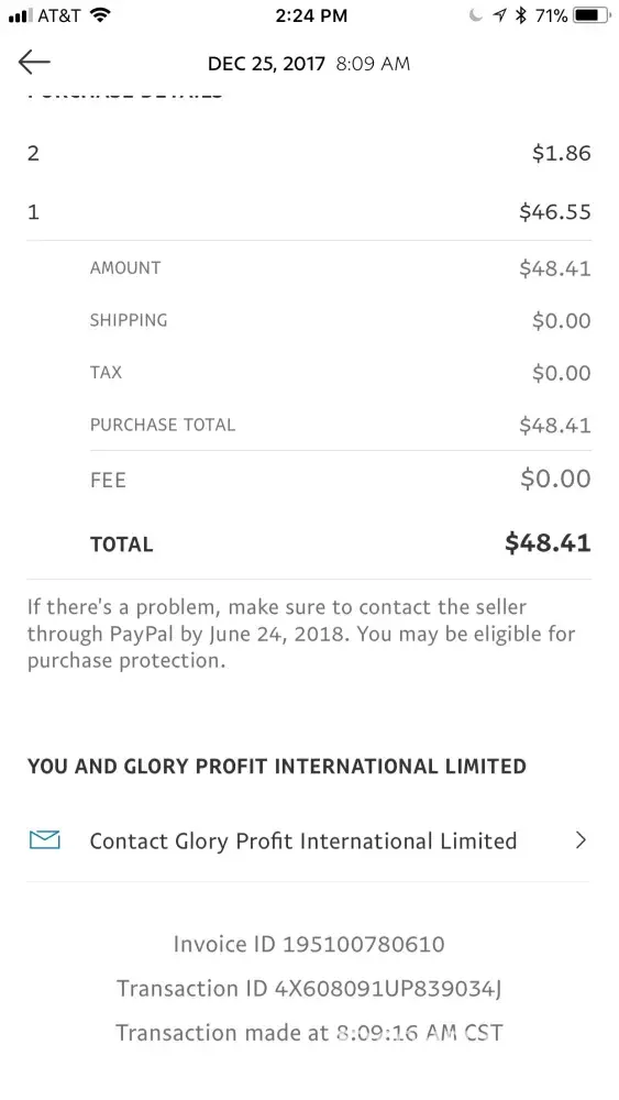 My purchase was for $18.86 CAD and Glory Profit Limited (Hong Kong based company)